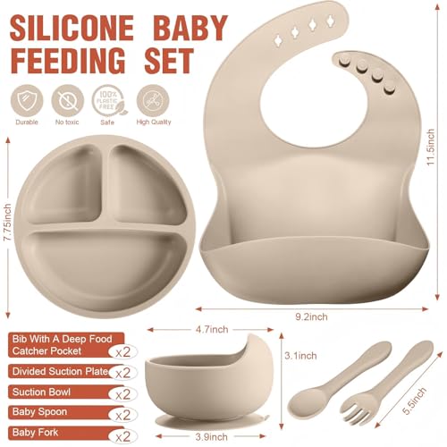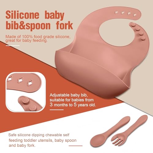 Complete Baby Feeding Set: you will get 2 pieces of bibs with a deep food catcher pocket, 2 pieces of divided suction plates, 2 pieces of suction bowls, 2 pieces of baby spoons, and 2 pieces of baby forks; With our feeding set, you will be happy to have a better, cleaner, safer mealtime experience with your little onesQuality Silicone: each baby utensil set is made of quality silicone, without BPA, completely safe and reliable, that is safe for babies to eat and chew on; The baby feeding supply is fridge, freezer, dishwasher and microwave safe, which is easy to washNo More Flying Saucers: the silicone bowl and the plate have reinforced suction bottoms and stick really well to plastic high chair trays or flat surfaces, that have a lot of strength to keep them in place and help avoid spillsEasy to Clean: the silicone toddlers eating supplies can be either a quick rinse or in a dishwasher, the bib has an adjustable neckline and the catcher pocket stays open and catches anything that spills, these silicone food supplies won't absorb food color or odor, making cleaning a breezeCute Gift Choice: the baby led weaning feeding set comes with everything you need to keep mealtime neat and tidy; Ideal for your baby or as a gift for the birthday, baby shower, baby milestone celebration or other special occasions