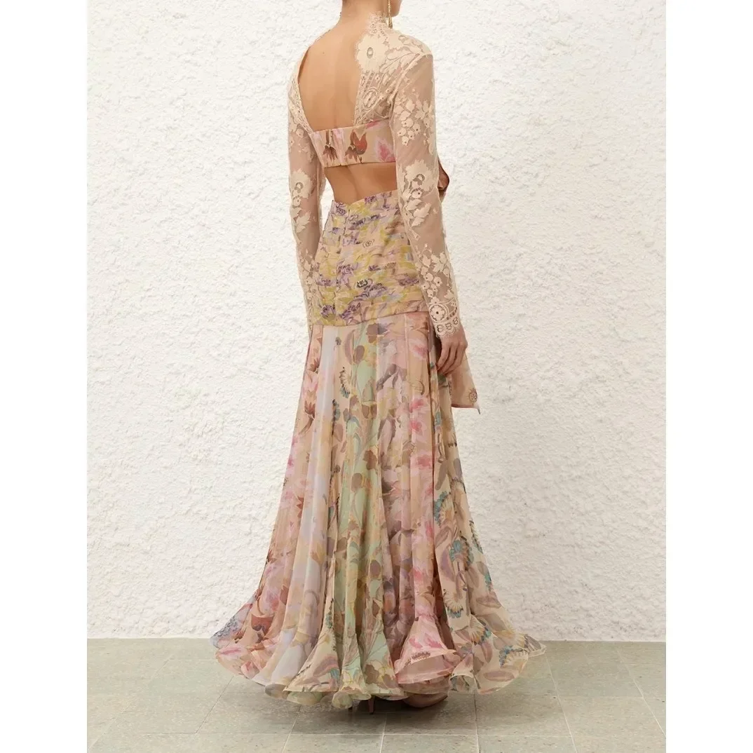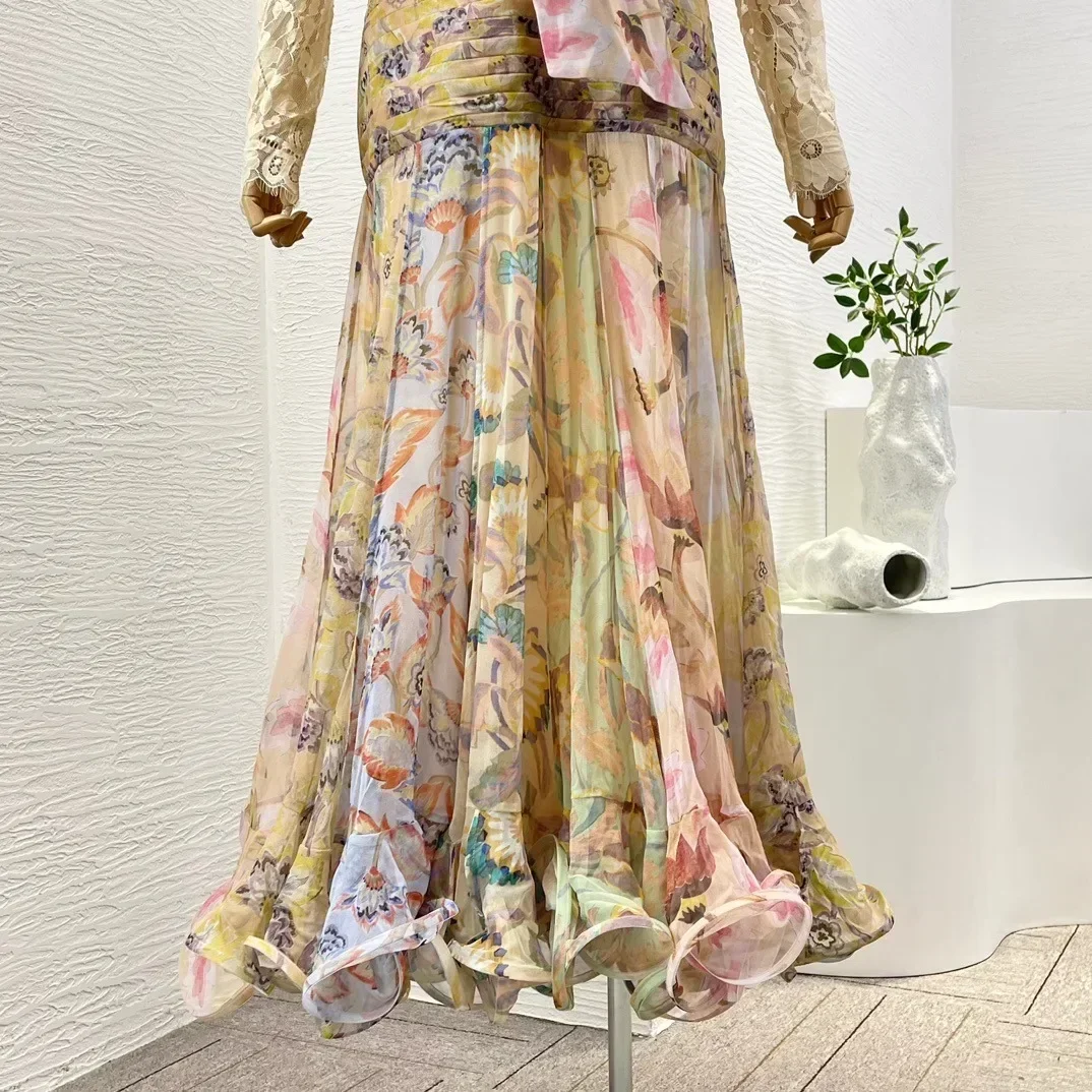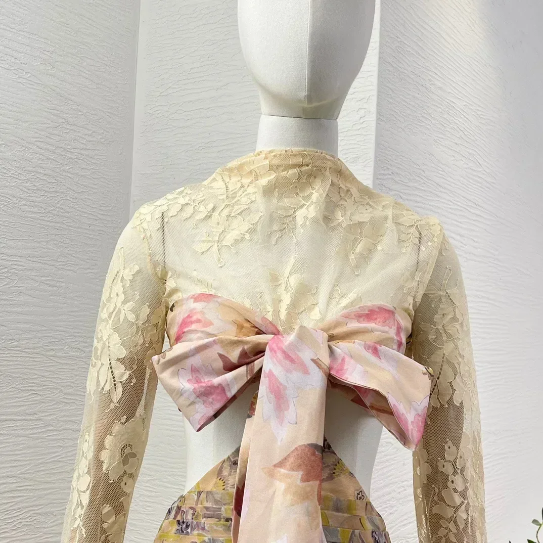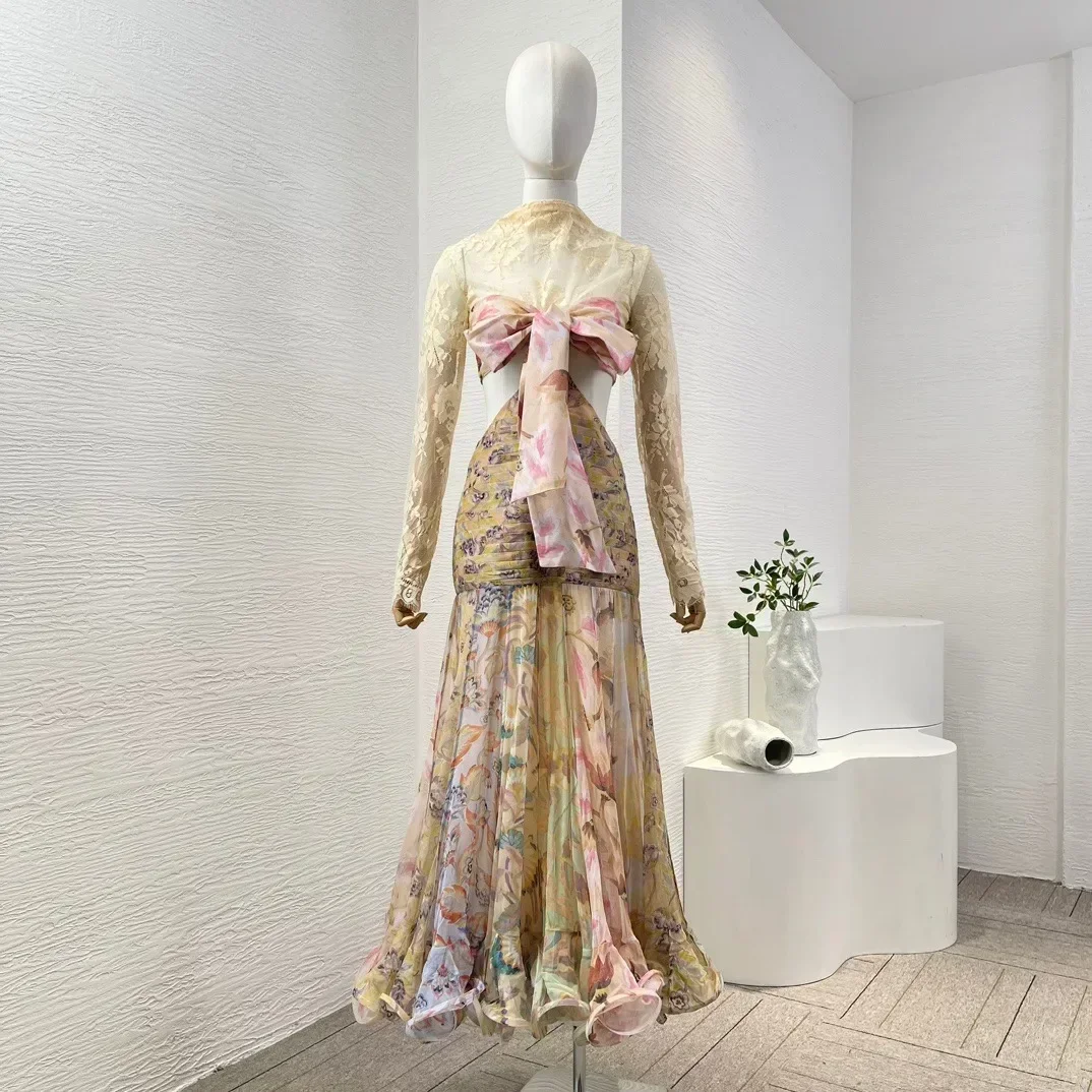 2024 New Hot Multicolor Floral Print Backless Long Sleeve Lace Patchwork Bow Pleat Maxi Women‘s Dress