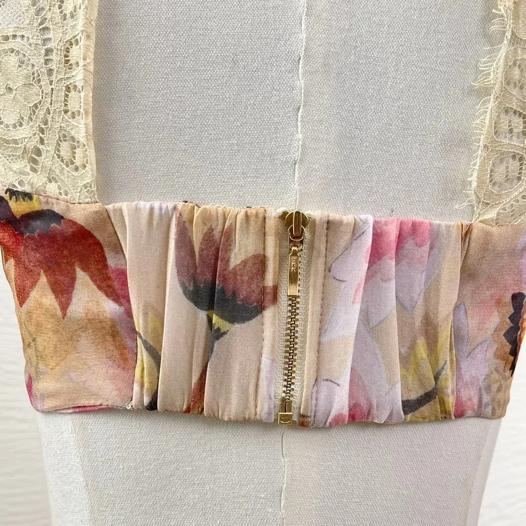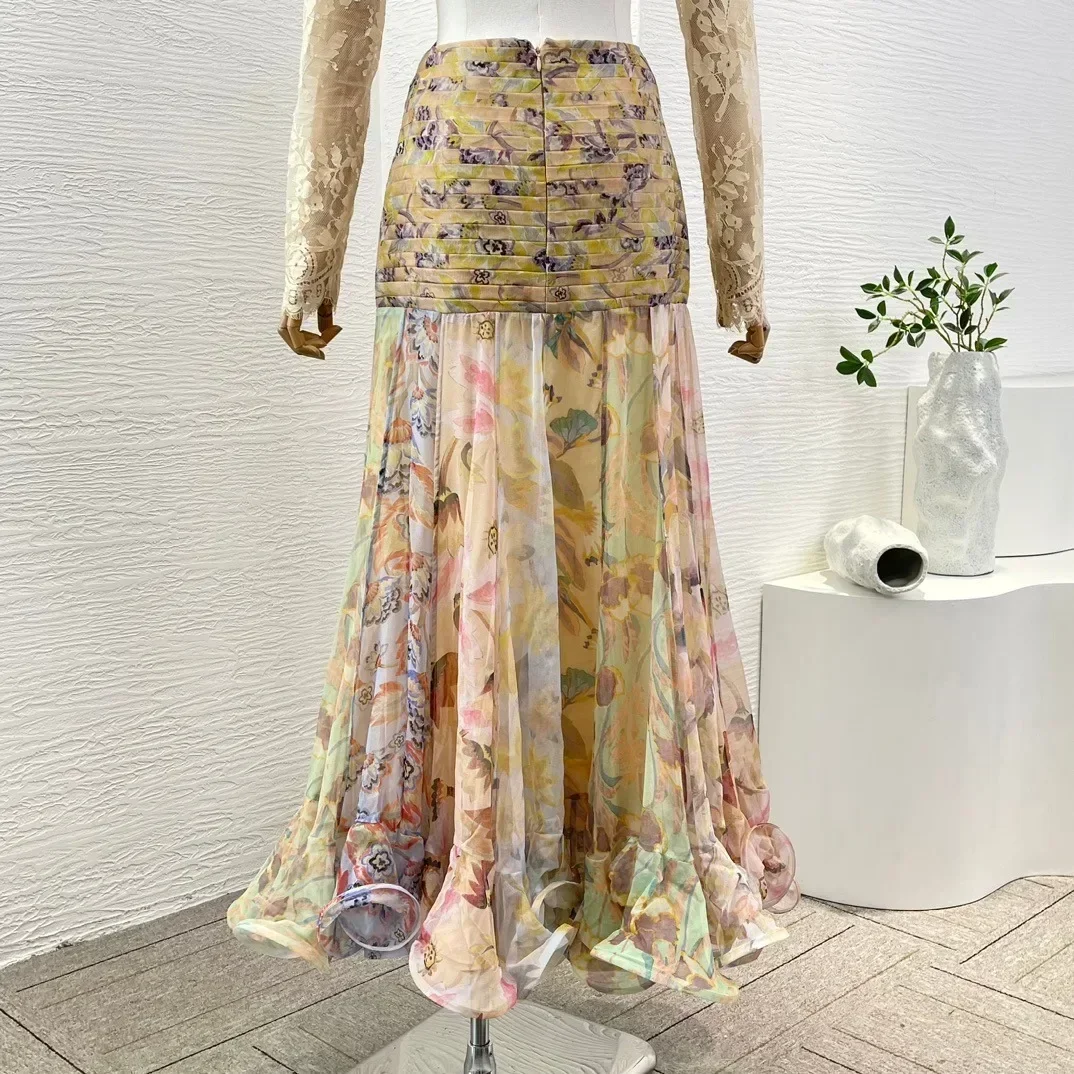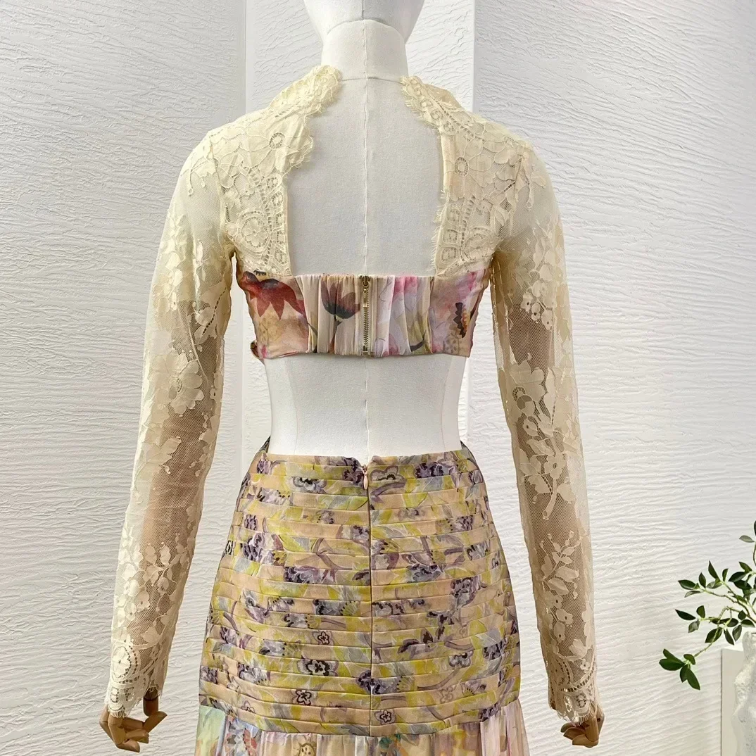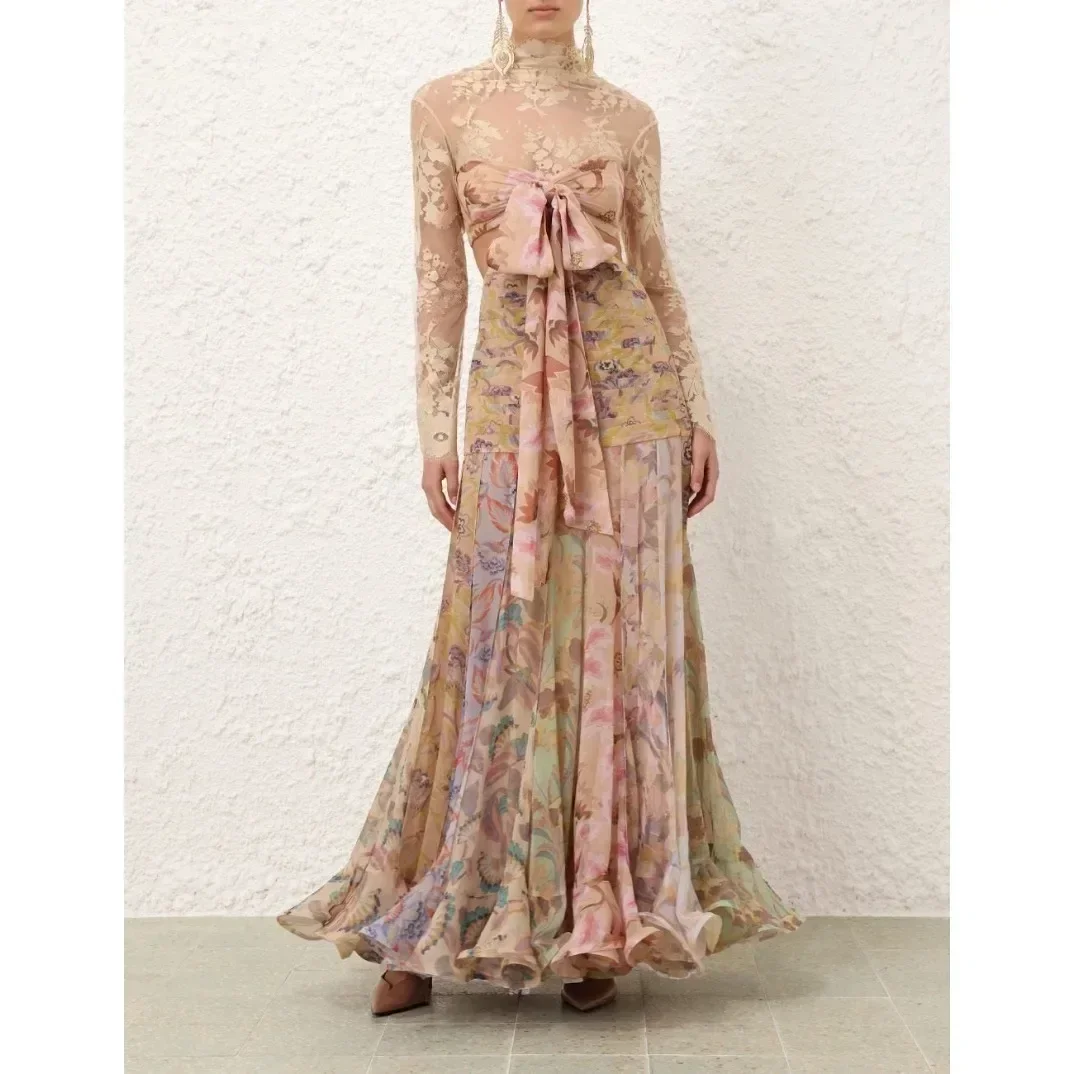 2024 New Hot Multicolor Floral Print Backless Long Sleeve Lace Patchwork Bow Pleat Maxi Women‘s Dress