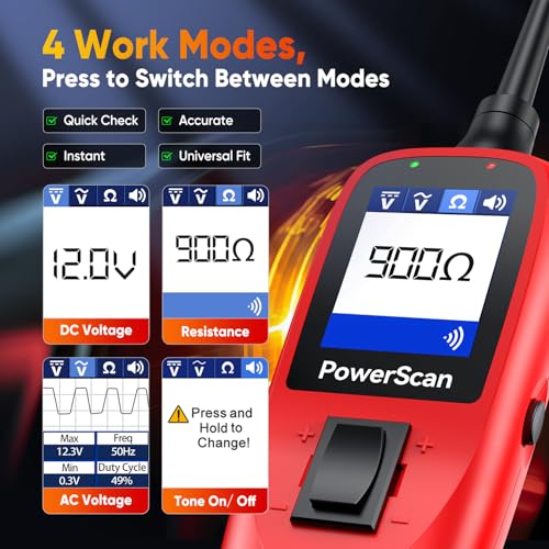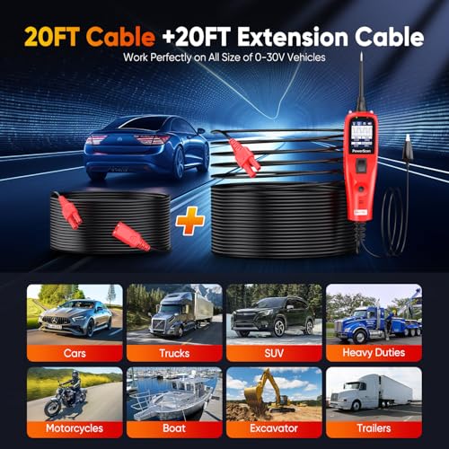 ?【Continuity Tests & Signal Tests】Put the Autel powerscan circuit tester in Resistance mode, using the probe tip with chassis ground or the auxiliary ground lead, continuity can be tested on wires, switches, relays and diodes attached or disconnected from the vehicle electrical system. Signal Circuit Test can be useful when you extract a DTC from the vehicle and realize the cause might be kind of sensor circuit, testing your sensor and you will find the answer.?【Voltage & Polarity Tests】Autel auto circuit test probe kit provides step-to-step guides to help you easily complete your test work. In DC Voltage mode, contact the probe tip to a Positive circuit, the red LED will light and the LCD displays the voltage with a resolution of 0.1V. If contact the probe tip to a Negative circuit, the green LED will light and the LCD displays the voltage with a resolution of 0.1V. And you will hear different beeps when testing on different polarity.?【Following & Locating Short Circuits】In most cases, a short circuit will appear as a blown fuse or a tripping of an electrical protection device. Use this power scanner probe tip to activate and energize each of the fuse contacts. The contact which trips the circuit breaker is the shorted circuit. While Autel short finder probe can test for bad ground contacts instantly, allowing you to follow and locate shorts fast without wasting fuses.?【40ft Long Wiring, Bright LED Lights】Autel 汽车用品 electric tester comes with a 20feet long cable and another 20ft extension cable that allows you to make the initial connection directly to the vehicle's battery whether how large the vehicle/ tractor is, you can have easy accessibility to connect the trailer effortlessly to the rear of the vehicle. And on the top of the tester, there is a built-in flashlight, illuminate your work in dark or night, making you detect faults effectively.?【Universal for All 汽车用品s, 100% Worry-F.ree Purchase】Autel PS100 electric circuit test kit can work on all 6-30V cars, boats, trailers, ATV, motor homes and many other vehicles and machinery to power components such as radiator fans, starter motors, relays, window regulators, windshield wipers, etc. Autel electric tester is backed by 1 year qua.lity war.ranty, 30 days full re.fund/ new re.placement. If need any technical sup.port, we are here for you 7/24.