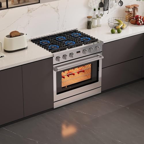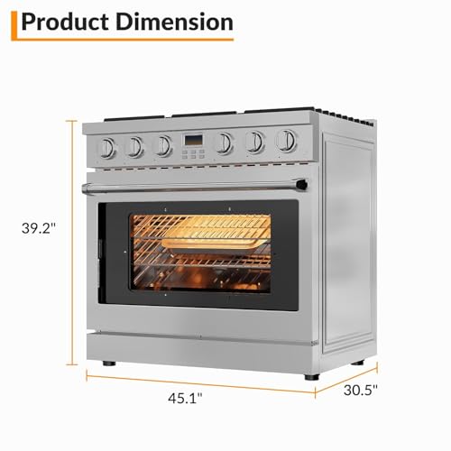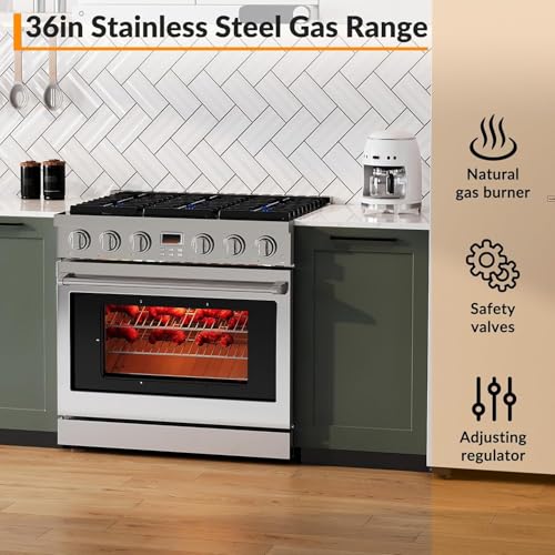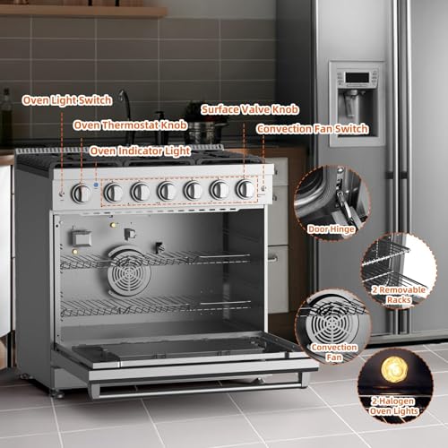 SPACIOUS COOKING CAPACITY: The 36-Inch Freestanding Oven Stove Combo features a spacious 6.0 cubic foot convection oven, perfect for all your culinary creations. A large window and two halogen lights let you monitor dishes effortlesslyCONVECTION OVEN: Spacious 6.0 cu. ft. oven features a fan to distribute heat evenly around the food and eliminate cold spots in the oven cavity, food cooks more evenly in less time and at a lower temperature than a standard ovenEFFICIENT HEAT RETENTION: This gas stove with oven offers powerful cooking performance with a 10,000-BTU broil burner and an 18,500-BTU U-shaped burner. The triple-layer glass door enhances heat retention and safetyEASY-CLEAN GAS RANGE: This slide-in gas range has removable black porcelain oven racks for easy cleaning. The stain and heat-discoloration resistant enamel surface offers great corrosion protection. Just wipe it down for a sparkling clean oven2 YEAR WARRANTY: We have a dedicated technical support team to help with any questions regarding stainless steel gas hobs. If you encounter any problems, please feel free to contact us through Amazon. Voltage:120V,Frequency:60HZ
