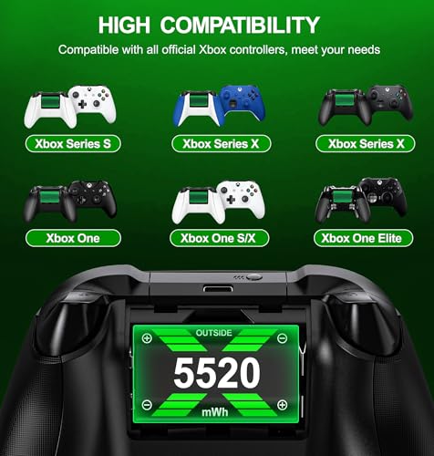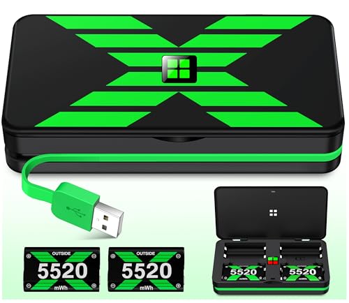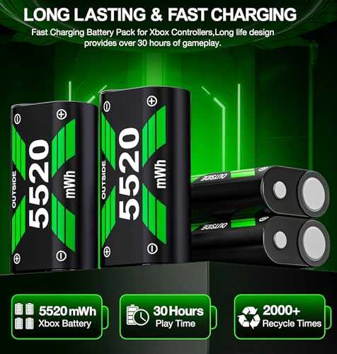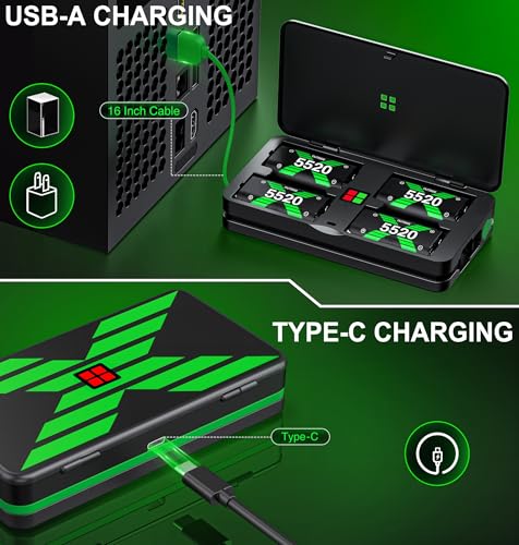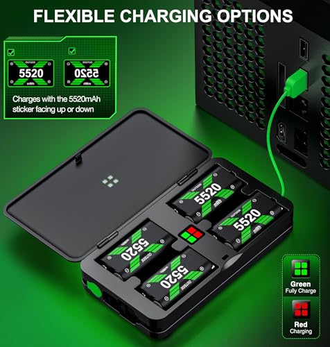 Simple charging for 4 battery pack for Xbox: The charging station supports charging up to four batteries simultaneously, with the same charging time whether charging one or four batteries, ensuring continuous game time without the worry of running out of powerFour 5520mWh Rechargeable Battery Pack for Xbox: Each of the four 5520mWh high-capacity rechargeable battery packs for Xbox offers over 2000 charge cycles, helping to save on AA battery costs and reduce landfill wasteAdvanced safety features & led indicators: Built-in smart chip provides overcharge, overcurrent, overheating, and short circuit protection. The charging box halts charging if batteries overheat, resuming once they cool down, allowing safe overnight charging. Equipped with LED lights, the rechargeable battery for Xbox Series S packs show red when charging and turn green when fully chargedProvides 25+ hours of gameplay time: Enjoy 25+ hrs of gameplay per charge. The rechargeable battery pack for Xbox can fully charge in just 5 hours, ensuring uninterrupted gaming sessions without frequent battery swaps or sudden game interruptions.A perfect Christmas gift for friends and family