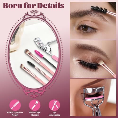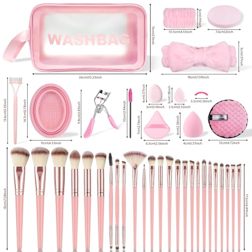 【Premium 25-Piece Pro Kit with Complete Tools】Get everything needed for flawless makeup: 25 makeup brushes, 12 sponges (6 large + 6 mini), 12 powder puffs (6 large triangle + 6 mini triangle), 6 finger puffs, 2 foundation sponges, 1 mirror, 3 mascara wands with replaceable heads, 1 face wash headband, 2 wristbands, 1 cleaning mat & a toiletry bag【Effortless Flawless Base & Eye Looks】 Go beyond brushes alone.makeup brush set Included sponges & puffs create a seamless, airbrushed finish for foundation and powder. Soft, labeled brushes and lash tools make dazzling eye makeup (blending, shadow, liner) easy and crease-free【Beginner-Friendly & Versatile Brushes】Each brush is clearly labeled for its primary use (foundation, contour, blending, etc.), eliminating guesswork for new users. Designed for multi-use versatility, allowing creative application beyond the label.The included mirror allows you to touch up your makeup anytime【Easy Clean & Travel Essential】 Practical accessories simplify routines. The absorbent headband keeps hair dry during skincare. Wristbands protect sleeves from water/makeup. The folding cleaning mat saves space, and the waterproof toiletry bag organizes and protects for travel【Perfect Gift in Premium Packaging】 Beautifully presented in sturdy, attractive packaging, this comprehensive set makes a thoughtful gift for Christmas, Mother's Day, Valentine's Day, Women's Day, birthdays, or any special occasion for makeup lovers