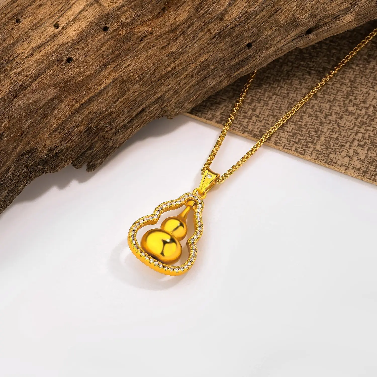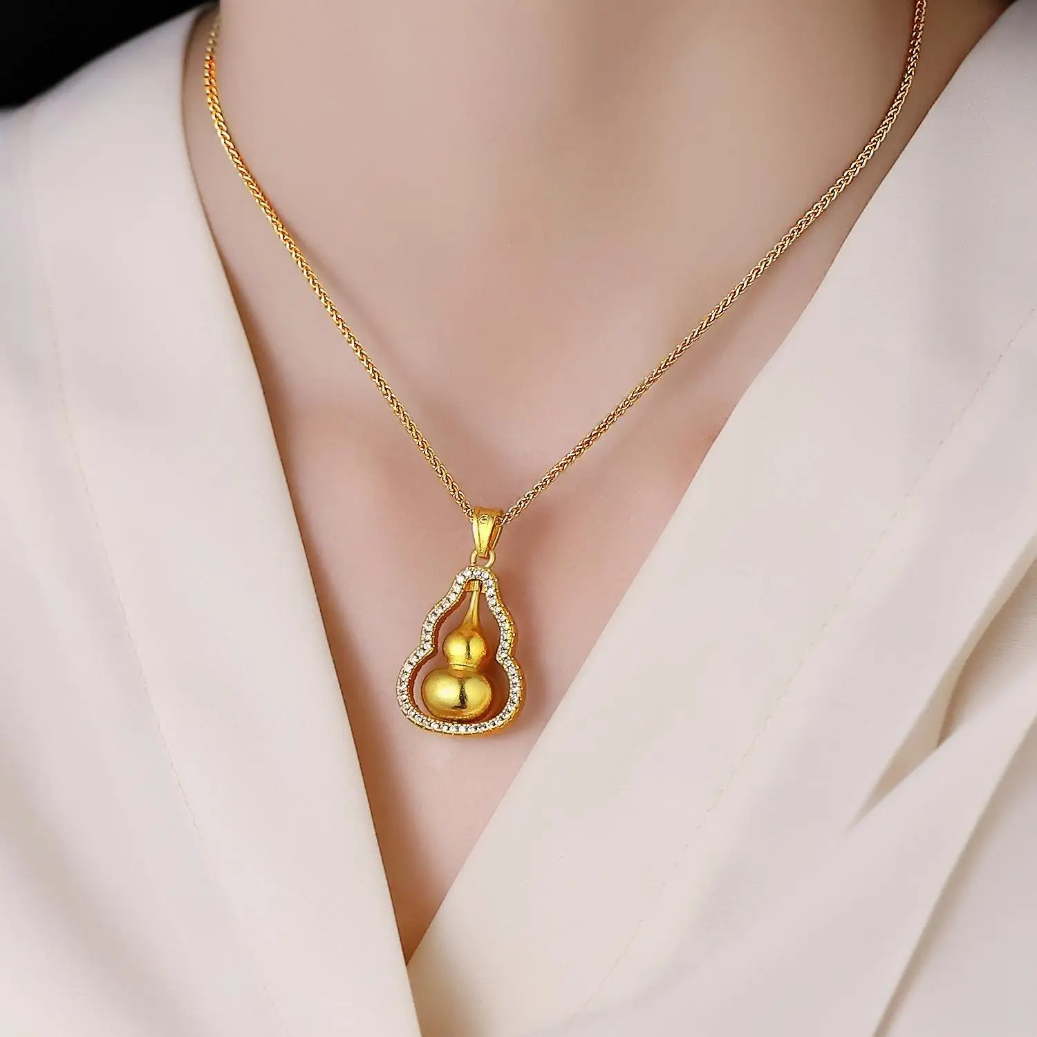 999 24K real gold gourd rotation necklace Women's fashion new Chinese ancient micro inset zircon design collarbone chain
