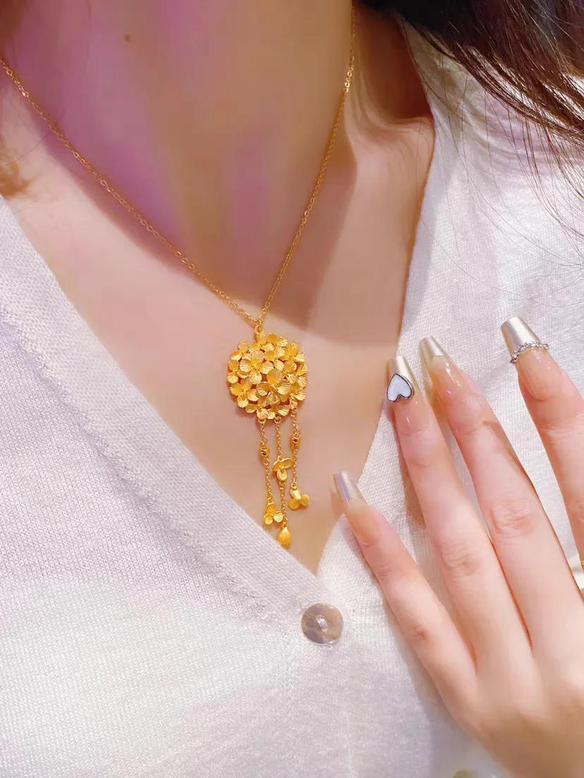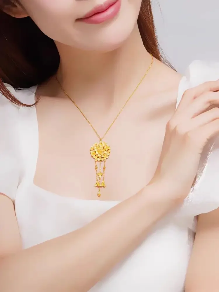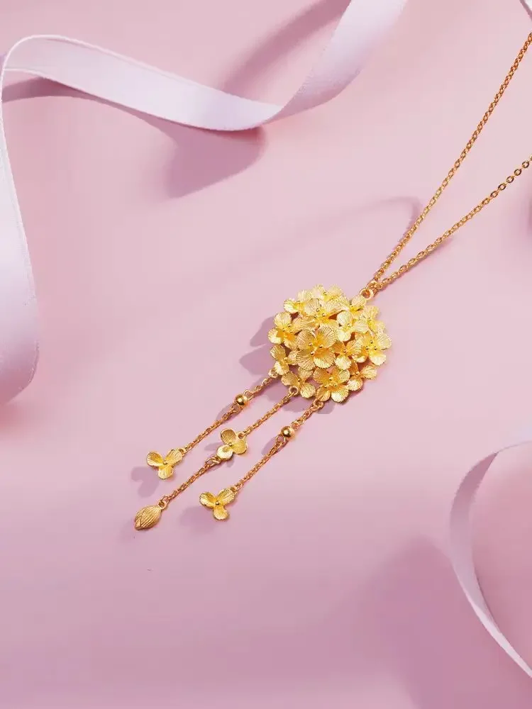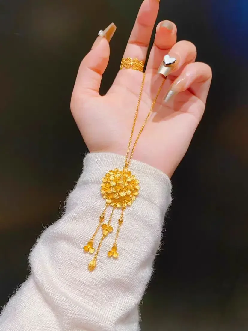 9999 real gold 24K yellow gold Hydrangea Tassel Necklace Fashion Antique Niche