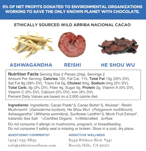 Raw Heirloom Dark (77%) Chocolate Enhanced with AdaptogensSugar-Free, Gluten-Free, GMO-Free, Nut-Free, Soy-FreeVegan, Paleo & Keto Friendly - Made using only the purest cacao and adaptogensPacked with powerful adaptogens - Reishi Mushroom, He Shou Wu and AshwagandhaDuring the hot months of the year, we ship all chocolate orders Monday-Wednesday using biodegradable insulation and cold packs to make sure the chocolate arrives to you in perfect condition.
