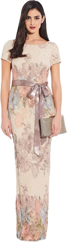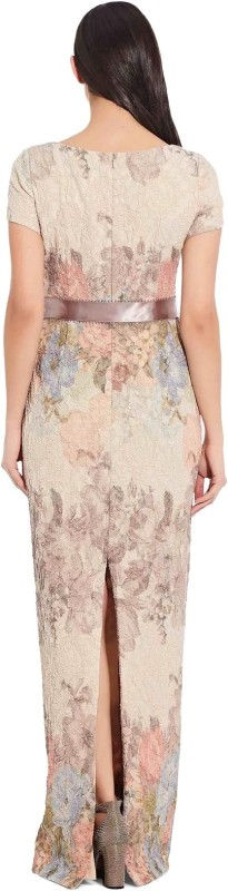 Eye-catching and glamorous, this textured cap sleeve gown features a stunning floral print and subtle metallic shimmer