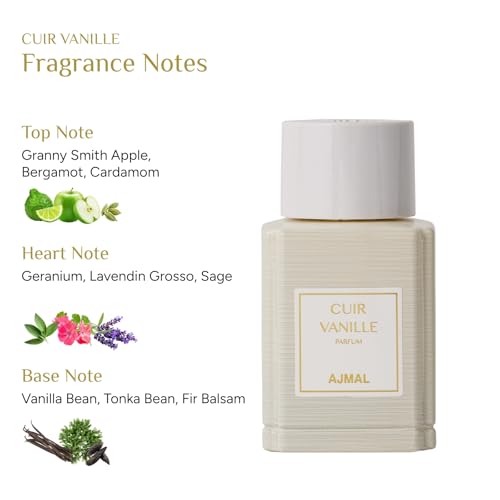 Masculine Vanilla & Leather Fusion: Ajmal Cuir Vanille redefines masculine sensuality with its bold combination of leather, amber, and creamy vanilla — a fragrance built for confidence and allure.Oriental Woody Signature: A warm composition of vanilla, tonka bean, and suede, layered with amber and musk, captures the essence of luxury and depth.French-Made Excellence: Expertly crafted in Dubai and perfected in France, this Eau de Parfum embodies Ajmal’s mastery in blending traditional oriental richness with modern Western refinement.Long-Lasting Scent Trail: A concentrated EDP designed for all-day wear — evolving from smooth sweetness to a deep, leathery sophistication that lingers powerfully.Luxury Gift for Men: Presented in an elegant bottle that reflects class and masculinity, ideal for gifting or as a refined daily signature scent.