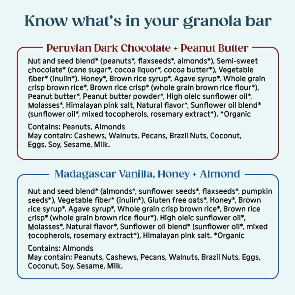 IRRESISTIBLE NUT & SEED DUO: Treat your taste buds to a symphony of flavor and nutrition with two mouthwatering flavors: Madagascar Vanilla Honey Almond and Peruvian Chocolate. Each bar is a deliciously balanced snack for any time of day.NUTRITIONAL POWERHOUSE IN EVERY BITE: Made with nourishing whole food ingredients and enriched with prebiotic fiber, these snack bars provide a harmonious balance of protein, healthy fats, and complex carbohydrates. Enjoy sustained energy and satiety without the sugar spikes, perfect for fueling your day.CLEAN INGREDIENTS YOU CAN TRUST: Designed to fit your lifestyle, these snack bars are Certified Gluten-Free, Organic, Non-GMO, Egg-Free, Soy-Free, Dairy-Free, and completely palm oil-free. They’re as kind to your body as they are to the planet, giving you a snack option you can feel great about choosing.IRRESISTIBLE SOFT-CRISPY TEXTURE: Bite into a snack that’s both soft and crispy, delivering a texture that’s as satisfying as the flavors themselves. Whether you’re savoring it on-the-go, as a midday pick-me-up, or as a guilt-free treat, these bars are sure to delight.SMART SNACKING, MADE DELICIOUS: Low in sugar, high in fiber, and packed with whole grains, these snack bars are a low-calorie option that doesn’t skimp on flavor. Perfect for lunchboxes, workouts, or a moment of indulgence, they’re a treat you can enjoy anytime, guilt-free!