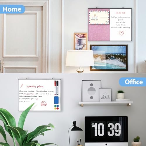 Double-Sided Design: The different designs on both sides is perfect for busy people. One side with combination board is for recording your monthly appointments, reminders,school activities, social events, one side with whiteboard can be used for your quick notes or memo.Modern Vision Board: Balance work, life and everything in between with our Dry Erase Cork Board Combo. Built with a durable aluminum frame in a simplicity black finish and colorful linen, this sleek bulletin board will add a contemporary touch to any home office, classroom, or home decor.Premium Quality & Easy to Hang: The erasable white board part is easy for writing and erasing without stains and ghostings. The high-fiber linen surface of the pinboard part is great for pinning notes, messages, pictures, memos and and more. The bulletin board is lightweight but sturdy. It is super easy to hang with two small hooks on the top.FSC Certified: The corrugated cardboard inside the dry-erase board is made of FSC - certified wood.Super Value White Linen Board Set: The 12" x 16" cork board white board combo comes with 2 markers, 1 dry eraser and 4 thumb tacks. Perfect for daily reminders, grocery lists, to-do lists, meal plans and grocery lists etc.
