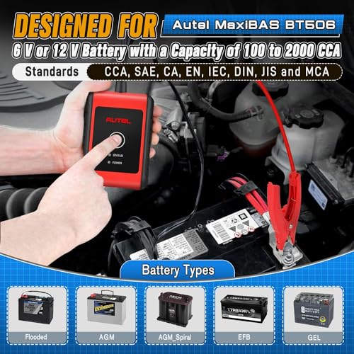?【3 Core Functions】① Battery Health Test - tell if the battery is in good working condition and gives advice on whether to replace the battery; ② Cranking/Starte Test - helps you test and analyze the starting motor to check it works properly or not; ③Charging systems test - check if the generator/rectifier diode/charging current is normal. It's much more convenient than driving miles to find the nearby auto repair shop.?【Extra-Safe Operation】Your safety is our priority. Different from other vehicle battery alternator analyzers, our Autel BT506 car battery load tester was equipped with 100% high-quality safety copper clip, which has reverse polarity protection, short-circuit protection and spark-proof function, which can achieve stable and safe connection during the test. It is widely for cars, suvs,mini-vans, trucks, marine boats, motocycle, trackors or other devices which equiped in 6v or 12v batteries.?【BT506: Bonus Features & Scanner Compatibility】Fully upgraded Autel BT506 keeps original price, adds 4 practical value-added features (test report view/share/print, battery location query, test data record & upload/backup, optional V200P to upgrade to BT508 with battery registration/repl.acement/electrical reset), fit for technicians, shops & factories. Compatible with 99% Autel wireless scanners (MK808BT PRO, MS906 Pro, MS909, Ultra etc.). Note: Not for Autel wired scanners.?【Dual-Scenario Flexible Testing, Full Demand Coverage】The Autel BT506 battery tester supports both on-vehicle and off-vehicle testing modes, adapting to different usage scenarios. The on-vehicle test provides one-stop access to battery state of charge (SOC), voltage, measured capacity, and exclusive maintenance suggestions. It can also detect core data of the starting system (such as cranking voltage, current, and duration) and the generator (including load/no-load voltage, load/no-load current, and ripple). The off-vehicle test directly checks the condition of batteries removed from vehicles, making it convenient for both on-board testing and standalone battery inspection.?【Lifetime Free Update & Free Mobile App】Download the free and easy-to-use mobile app, available for iOS and Android devices, to use with the BT506 to perform testing. Enjoys lifetime free update, lifetime tech support, 1-year warranty, 30-days return & replacement, and 24/7 thoughtful support. If you have any questiones, please feel free contact us via: ?✍️autelchoice @ outlook. com.