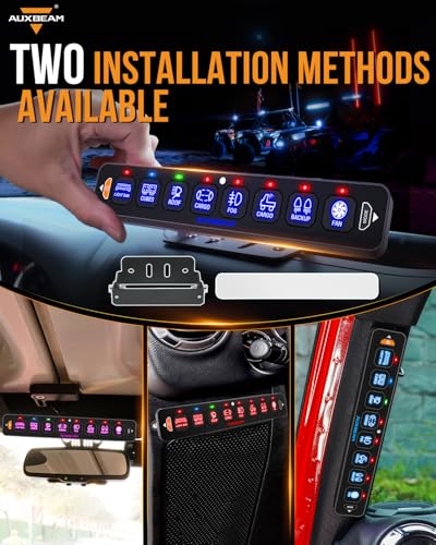 RGB Backlight Color: Auxbeam AS-R80 rgb switch panel offers unlimited options for RGB backlight colors to match the color of your car's interior LED lights or interior decorations. RGB mode no longer limits you to a single backlight mode.You can customize the colors to suit your preferences and needs.Smart Backlight Adjustment: The Auxiliary switch panel automatically adjusts backlight brightness based on the surrounding environment to visual distraction.The 汽车用品 switch panel includes a MODE button for easy backlight toggling.If the backlight appears too harsh in dark environments, simply turn it off to reduce eye strain.Upgraded Accessories: The upgraded accessories include a circuit box with a built-in solid-state relay, a 80A high-quality resettable circuit breaker, fuses, 60pcs stickers, mounting brackets, a 10ft wiring harness. It also comes with a dust cover to keep it clean and dust-free.Specification: IP65 waterproof rating. Operating voltage: DC 12-24V. Max power: 960~1920W. Maximum Current : 80A.Temperature range:-40~221°F. 2-year protection provided by Auxbeam.This Auxbeam AS-R80 slim switch panel DOESN'T support Bluetooth app control