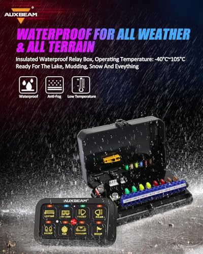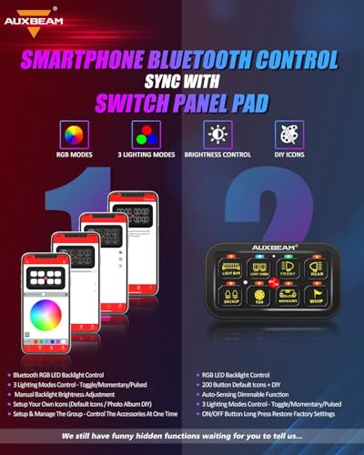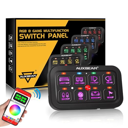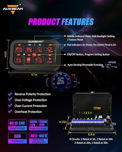 RGB 8 GANG SWITCH PANEL. Working voltage: DC 12-24V, max current: 60A, rated voltage: 12V 20A / 24V 10A; operating at 12 Volts: max power rating of 720W, operating at 24 Volts: max power rating of 1200W; operating temperature: -40°C - +105°C, IP65 waterproof rate.UPGRADE MULTI-FUNCTION SWITH PANEL. 3 lighting modes: Toggle - constant light, Momentary - ignition power, Pulsed - strobe mode. Not just "ON/OFF" switch panel for car, it can change the light color and lighting modes, control your device without extra switches or cables. Upgraded 60 button stickers for all your needs.AUXBEAM RGB AUXILIARY SWITCH PANEL. Unlimited color options matching your dash light, the latest LED switch panel can be operated via switch panel pad or smartphone Bluetooth, work synchronously. Manual light brightness adjustment & auto-sensing dimmable function.BLUETOOTH SWITCH PANEL. Auxbeam programmable switch panel for 汽车用品, LED light color selection, brightness control, basic color selection, color reset / DIY. You could also setting your own icons(200 default icons / photo album DIY), and setup the group to control 2 or more lights at the same time. APP universal fit for above Android 4.5 & IOS 9.0 version.SAFETY PROTECTION DESIGN. Our this switch panel is built-in solid state relay, not the external relay, provide over-voltage protection, reverse polarity protection, over-current protection, thermal protection, come with additional fuses for replacement, providing all your connected LED lights & accessories work safely.
