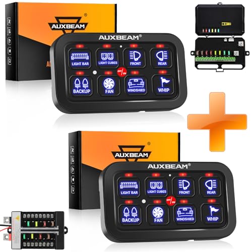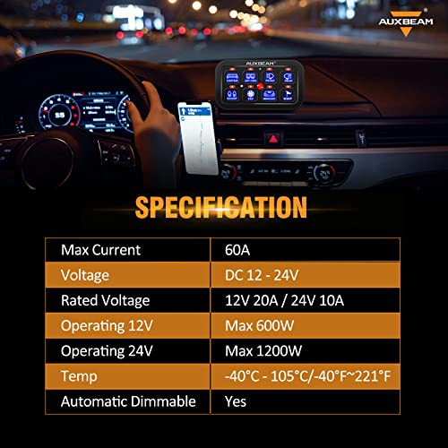 Technical Specification: Operating voltage: DC 12-24V, max current: 60A, rated voltage: 12V 20A / 24V 10A; operating at 12 Volts: max power rating of 600W, operating at 24 Volts: max power rating of 1200W; operating temperature: -40℉ - 221℉, IP65 waterproof rate, with high sensitivity, stablity and strong anti-interference ability.Automatic Dimmable Function: Newest 8 gang switch panel have automatic dimmable feature, the backlight brightness of the switch panel will change according the brightness of environment. The brighter the environment is, the brighter the backlight will be. The perfect 8 gang switch panel automatic dimmable designed, giving you a different user experience and ensuring your driving safetySafety Protection: Our this 8 gang switch panel is built-in solid state relay, not the external relay, provide over-voltage protection, reverse polarity protection, over-current protection, thermal protection, come with additional fuses for replacement, providing all your connected LED lights & accessories work safely.Easy Installation: No complicated wiring, no need to cut a big hole on your vehicle. Plug & play wiring harnesses ensuring you to connect the led lights or accessories easily. Two types of mounting bracket, you can install it anywhere you need. You can customize your personal switch panel with 60pcs self-adhesive labels. The best way to clean up all the wiring and add a single panel to control everything.Wide Application & Warranty: Taking limited space on some vehicles into account, this more compact size switch panel control system is perfect for all situations. Auxbeam 8 In 1 touch screen panel more suitable for your needs, such as truck, boat, off road, powersport, marine, atv, utv, suv, car, bus, heavy duty etc. 2 Year Manufacturer Warranty: free replacement for any quality problems by non-human reasons.