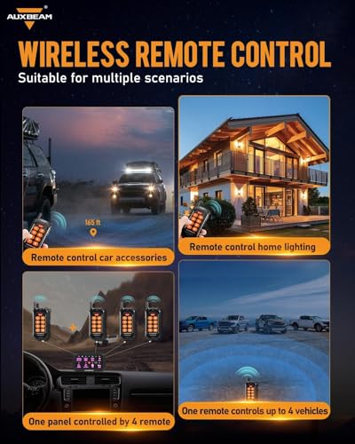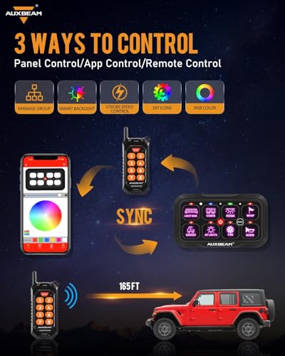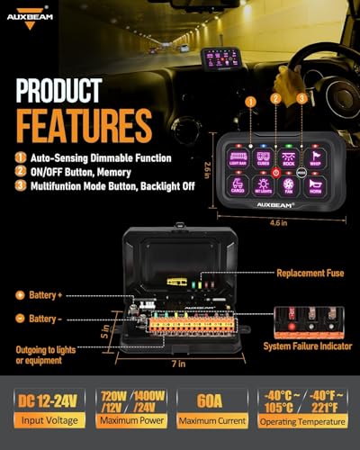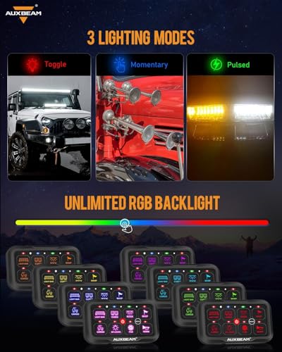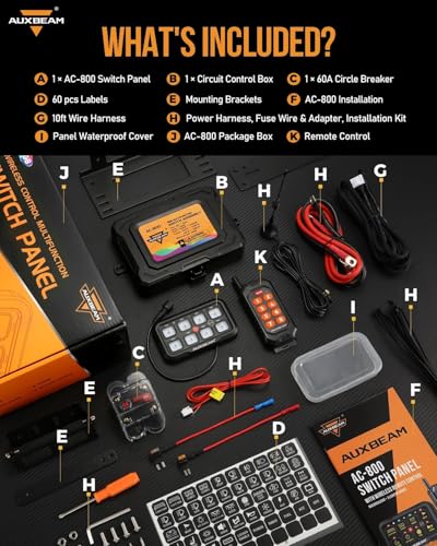 【App Bluetooth Control】Control your car accessories not only through the switch panel but also via the Bluetooth app. Customize panel colors, adjust brightness, set icons (200 default icons/photo album DIY), and control 2 or more lights simultaneously by setting groups - just set it up on the app.【Wireless Remote Control】AC-800 8 gang switch panel includes a remote control, allowing you to access the accessories whether you are inside or outside the car. The remote control easily adheres to metal surfaces for quick access. It comes with pre-installed batteries for instant operation.【Backlight Off&Automatic Dimmable】Bluetooth 汽车用品 switch panel has a mode button to easily turn the backlight on or off. If the backlight seems too harsh in dark environments, simply turn it off for a more comfortable visual experience. Adjust the backlight brightness manually via the app or rely on the panel's built-in light sensor for automatic adjustment.【3 Modes & RGB Color】Multifunctional switch pod can be programmed to 3 lighting modes. TOGGLE mode provides constant lighting, MOMENTARY mode only works when a switch pod is pressed ,and PULSED mode offers a strobe effect. Auxiliary switch panel offers unlimited options for RGB backlight colors to match your vehicle's ambiance.【Upgraded Accessories】 AC-800 switch controller can manage up to 8 gang 汽车用品 DC12-24V accessories. Even if you don't require all 8 channels right away, but have extra channels available for future expansion. The upgraded accessories include a circuit box with a built-in solid-state relay, a 60A circuit breaker, fuses, waterproof covers, 60pcs stickers, mounting brackets, and a 10ft wiring harness. Max power: 720~1400W.Temperature range:-40~221°F. 2 years warranty by Auxbeam.
