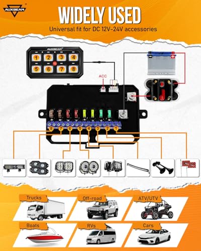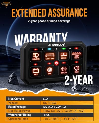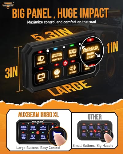 3 Lighting Modes: Auxbeam multifunction switch pod, not limited to ON/OFF and memory function, each button can also be programmed to 3 lighting modes: Toggle, Momentary and Pulsed.The red light means toggle, lights or devices always on; Blue light means momentary, lights or devices only stays on when you hold it down and turns off when you release it; Green light means pulsed, strobe mode.RGB Backlight&Auto-Dimming: Auxbeam RGB 8 gang switch panel allows you to choose from an unlimited number of colors to match your vehicle's color scheme and your personal preferences. The backlight brightness of the panel also adjusts automatically to the surrounding environment, providing a comfortable level of brightness for your driving experience.Widely Application: RA80 XL Auxbeam switch controller has an angular rock aluminum frame that gives it an aggressive, hard style to matches your vehicle's look. It can control up to 8 LED lights or electrical devices and can be easily installed anywhere in your car without complicated wiring. Widely used for off-road, truck, boat, RV, car, SUV, and yacht. 2-year protection provided by Auxbeam.Upgraded Accessories:Auxbeam RA80 XL switch panel has a working voltage of DC 12-24V and a maximum current of 60A. The rated voltage is 12V 20A / 24V 10A, and the maximum power is 720W/12V or 1200W/24V. The package includes 1 × RA80 XL switch panel, 1 circuit control box, 1 circle breaker, 60pcs labels, mounting brackets, a 10ft wire harness, power harness, fuse wire & adapter, and an installation kitThis Auxbeam RA80 XL switch panel DOESN'T support Bluetooth app control
