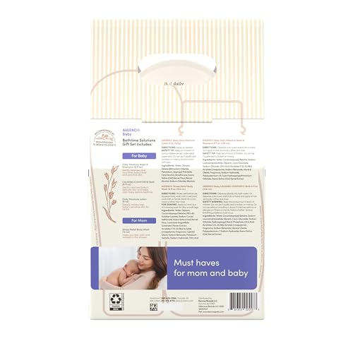 Mommy & Me Bath Essentials: 4-piece gift set includes baby daily wash & shampoo, calming bath & wash, daily moisture baby lotion, plus a stress relief body wash for mom; reusable wicker basket for storage; Pediatrician & Dermatologist RecommendedGentle & hypoallergenic Wash & Shampoo: soap, phthalate, and paraben-free formula gently cleanses baby’s hair and sensitive skin without drying; with natural colloidal oat; follow with Daily Moisture Lotion to help lock in hydrationCalming bedtime ritual: tear-free baby Calming Comfort baby bath & wash features soothing lavender and vanilla scent to help relax baby before bedtime; use as part of a gentle nightly routine24-hour moisture: the non-greasy baby lotion is clinically proven to hydrate and soothe baby’s delicate, dry skin; fragrance-free, quick-absorbing formula; apply after bath to help seal in hydrationNew mom gifts set: Aveeno Baby newborn bath essentials kit relaxes & moisturizes baby & mom. Includes Aveeno Stress Relief Body Wash for mom that combines colloidal oat with scents of lavender, chamomile & ylang-ylang oils for a relaxing cleanse