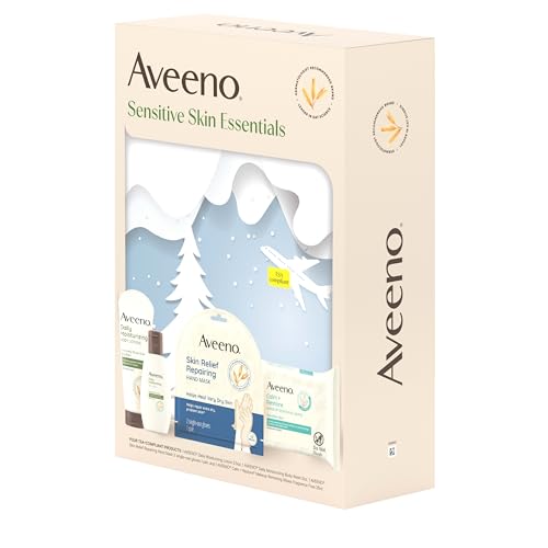 Soothe dry, sensitive skin with this Aveeno Sensitive Skin Essentials Gift Set. The sensitive skin care set contains everything you need to nourish dry skin including lotion, body wash, makeup remover wipes and moisturizing hand masksThe Calm + Restore Makeup Remover Wipes are formulated with soothing oat extract and calming feverfew. These unscented facial cleansing wipes effortlessly remove all traces of dirt, oil, & makeup, even waterproof mascaraOur Daily Moisturizing Body Lotion, formulated with prebiotic oat, absorbs quickly and offers intense hydration for 24 hours. The unscented lotion replenishes your skin's moisture barrier, leaving your skin soft, beautiful and healthy lookingAveeno Daily Moisturizing Body Wash is formulated with prebiotic oat and gently cleanses to reveal smoother, softer skin. This body wash is formulated for sensitive skin and features a lightly scent with a fragrance designed to be gentle on skinTreat your hands to the Skin Relief Repairing Hand Masks, designed as single use, easy-to-use, no-drip gloves that restore moisture to extra-dry skin, ensuring hands look and feel soft, smooth, and rejuvenated