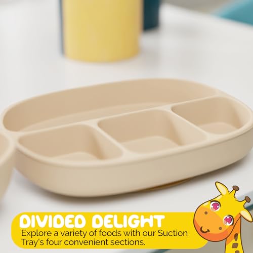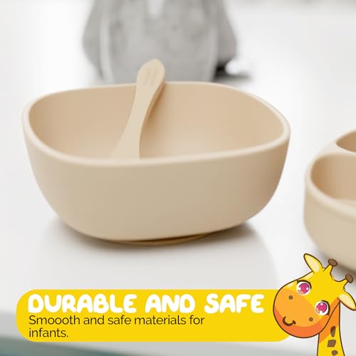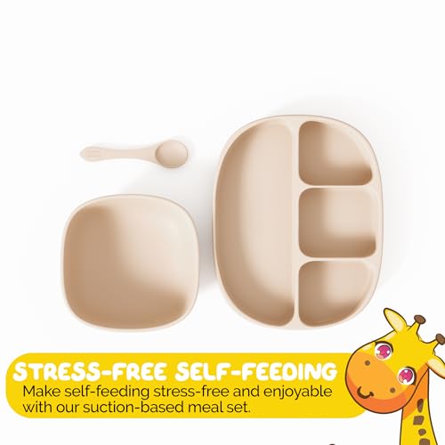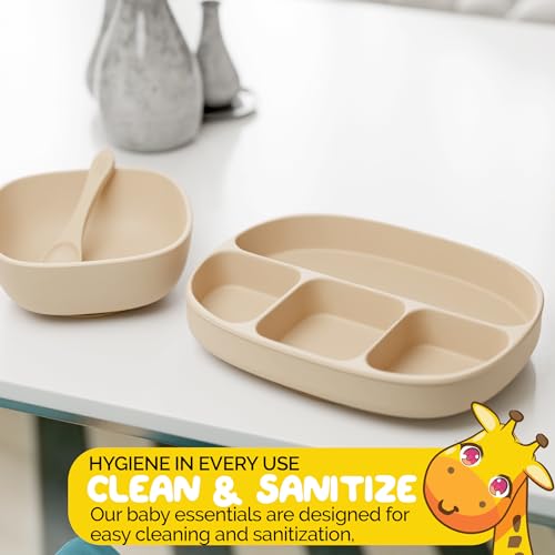 ? Suction Base Baby Supplies - Securely grips surfaces, preventing spills and messes during mealtime with our Toddler Suction Plates and Bowls set.? Sectioned Tray and Suction Plates for Baby - Organizes food into separate compartments, promoting balanced eating habits with our Baby Plates with Suction.? Durable Construction Silicone Baby Feeding Set - Made from high-quality, food-grade silicone, ensuring long-lasting use for Baby Eating Essentials.? Easy to Clean Baby Registry Must Haves - Dishwasher-safe baby necessities and stain-resistant baby registry items, making cleanup a breeze of our Baby Led Weaning Supplies.? Versatile Baby Registry Must haves - Perfect for use at home or on the go, providing convenience for busy parents including Baby suction Plate, Suction Bowl and Baby Food Spoon.