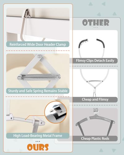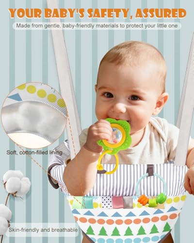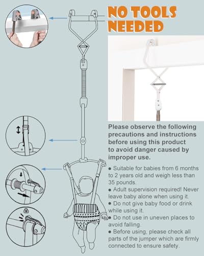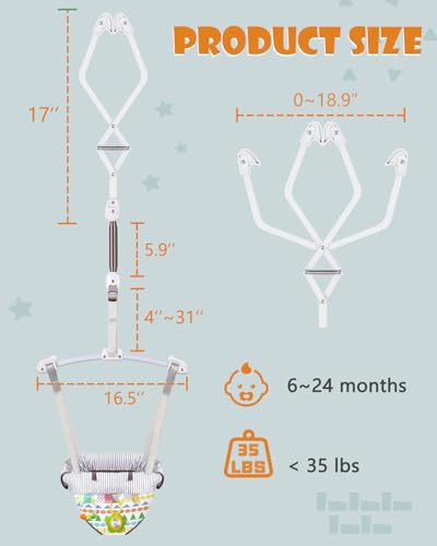 【Smart Adjustable Design】Easily adjust the height to fit babies from 6 months up to walking age (up to 35 lbs), growing alongside your child【Portable & Instant Setup】A true Clip-and-Go doorway bouncer with tool-free installation. The lightweight frame makes it easy to move and store for use anywhere【Safety Assured】Rest easy with this secure baby door jumper, featuring a rigorously tested spring and clamp for stable, safe indoor fun【Interactive Fun】This baby jumper Includes rattle and teether for added tactile exploration, encouraging sensory development while your baby jumps with joy【Machine-Washable Fabrics】The soft jumper seat is completely wipeable and machine-washable, offering ultimate convenience for quick cleanup