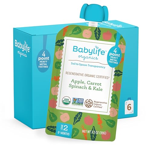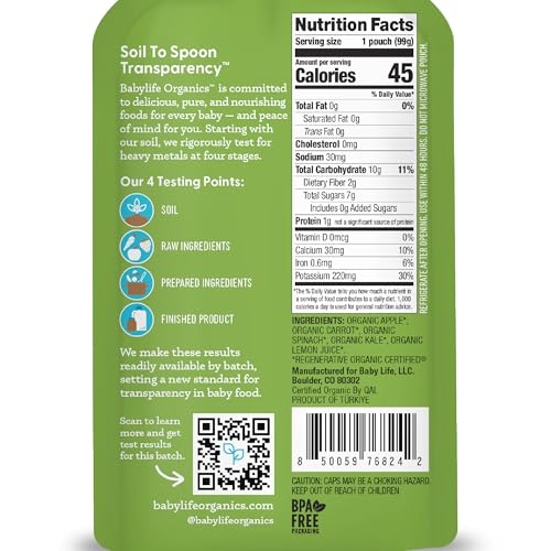 ORGANIC BABY FOOD: Includes (6) 3.5-ounce pouches of Babylife Organics Apple, Carrot, Spinach & Kale Baby Food. Made with regenerative organic ingredients, this non-GMO, gluten-free formula contains no concentrates, additives, or added water for pure, wholesome nutrition.TESTED 4 TIMES FOR HEAVY METALS: Babylife Organics uses a multi-point testing process that follows standards from the EU Food Safety Policy and The Clean Label Project. Until the baby food industry aligns on a common standard, we're more than happy to draw a line in the soil.SOIL TO SPOON TRANSPARENCY: Our unwavering commitment to 4-point heavy metal testing with readily accessible results. Every batch is matched with a QR code parents and caregivers can scan for heavy metal testing results presented in a way that is easy to understand.REGENERATIVE ORGANIC CERTIFIED: Certified by the Regenerative Organic Alliance, our farming goes beyond organic—supporting soil health, biodiversity, and rural communities for a better planet and healthier future for all.SIMPLE + CLEAN: Cleaner, safer baby food starts with better farming. From soil to produce to finished purees we know everything about where our food is grown and how it's made - and now, so do you.
