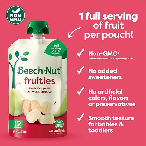 DELICIOUS FRUIT BLENDS VARIETY PACK: This variety pack contains (6) Banana, Pear, Sweet Potato, (6) Apple, Sweet Potato, Pineapple and (6) Peach, Apple, Strawberry baby food pouches. Each pouch contains one full serving of fruits, making it easy to squeeze more nutrition into your little one's day.NO ARTIFICIAL PRESERVATIVES, COLORS OR FLAVORS: Our baby food purees are made without artificial preservatives, colors or flavors and have no added sweeteners--just what you'd expect for baby's first foods.NON-GMO, DAIRY-FREE & GLUTEN-FREE: These fruit purees are free of dairy, gluten, nuts and soy and made with ingredients that are not genetically modified.SMOOTH TEXTURE FOR INTRODUCING SOLIDS: Whether your baby is just starting solids or learning to master self-feeding, our purees are blended to a smooth, easy-to-eat texture your baby will love.CONVENIENT POUCHES FOR ON-THE-GO: This variety pack comes with 18, 3.5oz squeezable pouches to easily feed your baby anytime, anywhere.