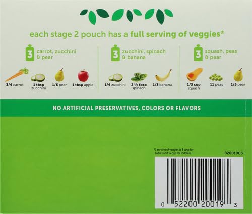 Variety Pack includes (3) carrot, zucchini & pear, (3) zucchini, spinach & banana and (3) squash, peas & pear pouchesDelicious blends of nutritious veggies like spinach, carrots, zucchini and moreNo artificial preservatives, colors or flavors and no added sweetenersNon-GMO (made with ingredients that are not genetically modified)Stage 2 for babies 6 months and up
