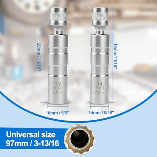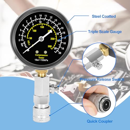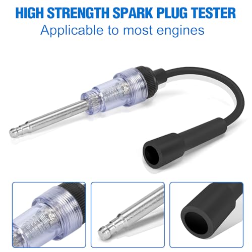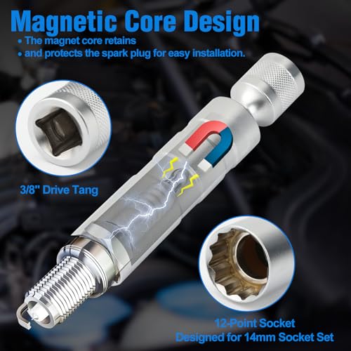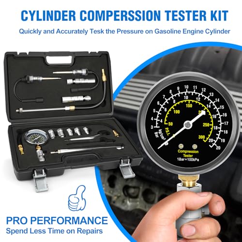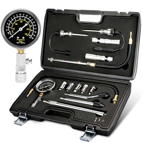 The engine compression tester kit is used to test the pressure of petrol engines to help determine cylinder problems, not applicable to crude oil engines.Specifications 3/8" driver 14mm&16mm magnetic rotating spark plug seat adopts 12 point design. Features a unique bump design that enhances grip friction and allows you to remove spark plugs more easily.The swivel head firmly grips the ratchet, and the top holds the spark plug to ensure it is securely held in place during installation and removal without worrying about losing the spark plug.The thin-walled design makes it compatible with BMW, compatible engines and various MINI models such as R55, R56, R57, R60, etc.The 15pcs compression tester kit comes with 10 different connect adapters, widely suitable for most types engine cylinder such as car, ship, truck, lawn mower, ATV, boat and so on.