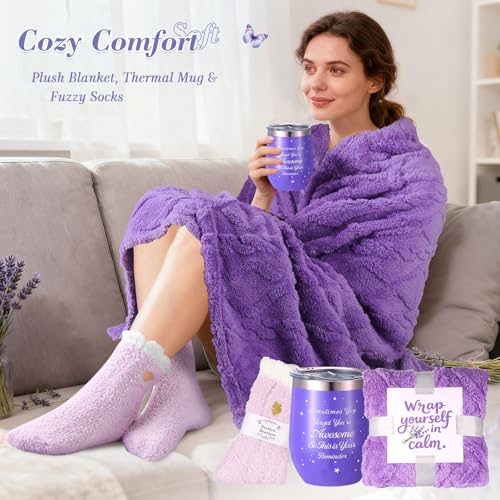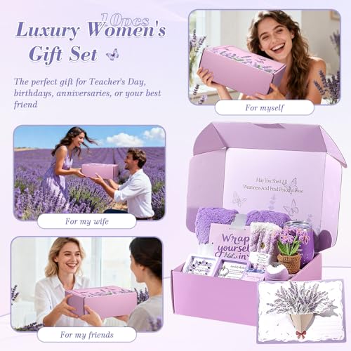 Luxury Birthday Gifts for Women: Want to pamper the woman who deserves to be spoiled? Choose Fesveoke Lavender Relaxing Spa Gift Basket—carefully designed and curated for your special lady. It comes with 10 extraordinary pieces: a luxurious warm blanket, 12oz insulated tumbler, handmade soap, bath bomb, lavender scented candle, pair of soft fuzzy socks,crochet flower ,gift card, crystal keychain & crystal bracelet and an elegant purple gift box. Perfect for any occasion to express your gratitude, love, care, and encouragementHigh-End Self Care Gifts for Women: Tired of generic gifts? Fesveoke luxury self-care gift package redefines meaningful gifting. Each item is crafted with premium quality to offer her comfort during recovery, stressful times, or simply because she deserves it. It’s an excellent choice as friendship gifts for women, nurse gifts, get-well gifts for women after surgery, bosses day gifts for women,employee appreciation gifts, teacher gifts, and graduation gifts,thank you gifts for women—gently reminding her how much she’s cherishedPersonalized Gifts for Women :Elevate your gifts for women who have everything with our exquisite lavender-themed collection—offering a refreshing alternative to ordinary presents. Designed to bring joy to her special moments,This is such a cute gift set for somebody who loves everything purple!NOTE: PLEASE ADD YOUR PERSONALIZED CUSTOM MESSAGE OR CHOOSE WRAP IN GIFT BAG BY CHECKING "Add gift options at checkout"Thoughtful Relaxing Spa Gifts for Women:Picture this: It's her birthday, and she opens this luxurious purple gift baskets.lights the lavender scented candle.Paired with the aromatic bath bomb and diamond soap, they create a luxurious spa-like bathing experience that calms the mind and soothes the body,perfect bath sets for women gift enjoy luxury spa at homeGet Well Soon Gifts For Women:Send your best wishes and help her feel better with our get well soon gift baskets for women. Perfect as after surgery recovery gifts, sympathy gift baskets, cancer care packages, bereavement gifts, and feel better gifts, it offers soothing comfort and heartfelt encouragement. Thoughtfully designed to lift her spirits, ease stress, and remind her she is cherished and supported during recovery, difficult times, or any moment she needs extra love.The relaxing items like the scented candle and plush blanket can aid in her recovery and lift her spirits