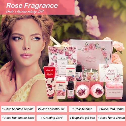 ?【Unique Pampering Gift For Women】 The pamper set is packaged with an beautiful designed gift box, it is modern and elegant, "Endless Blessing" expresses your wishes. Filled with lovely and thoughtful gifts inside, each item is carefully selected and each box is hand wrapped with care. This set once opened will bring her the sweetest surprise and make her feel so loved on her special day.?【All In One Spa Gift Set For Her】This care package contains 9 pieces of interesting little things with charming fragrance, that will give her a different surprise!✨1* Lavender Scented Candle; 2* Lavender Essential Oil; 1* Lavender Sachet; 2* Lavender Bath Bomb; 1* Handmade Soap; 1* Lavender Hand cream;1* Greeting Card 1* Exquisite gift box✨All the items are in matching rose color, making the whole set vert complete and thoughtful. A must for self care and bath time!?【Relaxation and Self Care】Our Spa Gift Box has everything a woman needs! Pamper yourself or loved ones with our carefully curated spa care package designed for ultimate relaxation. Ideal for moms, friends, co-worker, daughter, grandma or even a special treat for yourself. Close your eyes, take a deep breath and feel the rose scent from nature. Help you to ease away stress, unwind and restful sleep.?【Perfect Gifts Ideas For All Occasion】Whether it's a birthday, Mother's Day, Thanksgiving Day, Christmas, Valentine's, New Year's Day, Anniversary Day, or get promoted, Graduation, get engaged, get well soon gifts, after surgery recovery gifts, thinking of you gifts, cheer up gifts, self care gift, the warm gift box is suitable for everyone you care about.This unique and sweet gift idea is perfect to express your love and make her heart smile.?【Impressive Birthday Gift For Women Who Has Everything】The relax birthday pamper gift set made from luxury natural rose blends and aromatherapy essential oils,is perfect relaxing bath sets, let you have a complete Spa experience at home. This gift box is ready to give or mail it direct to your loved one, Pamper and indulge your special lady with a stunningly beautiful and elegant gift package.