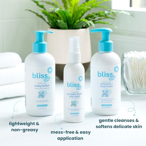 Is this baby care set safe for newborns and sensitive skin - Yes. All formulas are dermatologist tested and made specifically for newborns and infants. They are fragrance free, vegan, cruelty free, and gentle on sensitive baby skin, making them ideal for daily use.How does the diaper rash spray help protect baby skin - The zinc oxide spray creates a protective barrier that seals out moisture to help prevent and soothe diaper rash. The spray format allows for mess free application without rubbing irritated skin. Aloe vera, shea butter, and olive oil help calm redness and discomfort.Does the baby wash and lotion provide enough moisture - Yes. The baby wash and lotion are enriched with shea butter, cocoa butter, coconut oil, and sunflower oil to gently cleanse while delivering deep hydration. Helps support the skin barrier and keep baby skin soft, smooth, and moisturized.Is this a good baby shower or newborn gift - Absolutely. The set is beautifully packaged and includes both baby skincare essentials and a cozy hooded towel. It is a practical and thoughtful baby shower gift that parents can use every day.Where is Bliss Baby made and what ingredients are used - Proudly made in the USA with globally sourced, high quality, plant based ingredients. Designed for parents looking for clean, gentle, and trusted baby care products.