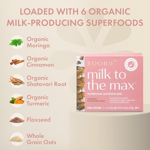 MILK-BOOSTING LACTATION BARS – Our Milk to the Max Bars are expertly formulated to increase milk supply with one convenient, ready to eat bar – no more pills to swallow, no more teas to brew! Enjoy one delicious bar (or more) for best results.BREASTFEEDING ESSENTIALS – Our Oatmeal Chocolate Chip lactation bars for breastfeeding provide 6g of fiber and are a healthy alternative to lactation cookies. The ideal lactation supplement for nursing moms6 POWERFUL SUPERFOODS – Made with superfoods like Moringa, Turmeric, Cinnamon, Shatavari, Flaxseed, and Whole Grain Oats for milk-boosting lactation support.INGREDIENTS MOMS TRUST - Gluten-Free, Dairy-Free, Vegan, Soy Free, Non-GMO, Certified Kosher, and Fenugreek-Free. Made in the USA.CREATED BY CERTIFIED LACTATION CONSULTANT - Founder, Nurse Wendy, is an RN and International Board Certified Lactation Consultant (IBCLC). She expertly crafts all Boobie products for optimal support of motherhood.