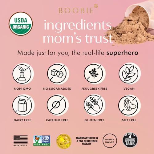 Your Daily Dose of Boobie-Approved Superfoods: Supermoms, get ready for a super boost! Our vegan protein powder comes loaded with 19g of plant based protein, nine organic superfoods, only 1 net carb, zero sugar, and 1000 IUs of Vitamin D—everything busy moms need in one delicious protein shake!Power Mama Needs, Taste Mama Loves: Whether you're nurturing a bump, breastfeeding your little one, or running after a toddler, our protein shakes are brimming with superfoods like Moringa and Turmeric to keep you energized and healthy. Did we mention it comes in a delicious Coffee Caramel flavor?Clean & Trusted by Moms In Every Stage: Boobie Body protein drinks are organic, gluten-free, dairy-free, and made without GMOs, giving you peace of mind and the cleanest protein superfood powder for every stage of motherhood.Crafted by Experts: Our prenatal and postpartum care protein shake was crafted by Wendy Colson, registered nurse (RN), International Board-Certified Lactation Consultant (IBCLC), and mother of three, to make meal replacement for weight management and post-workout recovery even easier for every mama.Explore More Superfoods for Supermamas: From lactation supplement bars to daily vitamins, Boobie has much more superfood-powered goodness and mom postpartum essentials in store to support your journey through motherhood. Find your faves today so you can seize every moment with joy and vitality.