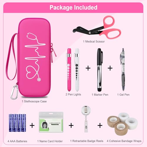 Nursing Kit: Comes with a stethoscope case with supplies, contains 1 pc stethoscope case, 1 pc medical scissors, 2 pcs medical pen lights with 4 AAA batteries, 4 pcs self adhesive bandage wraps, 1 pc marker pen, 1 pc gel pen, 1 pc ID card holder with reel clip. 15pcs stethoscope case sets, great for nursing student.Stethoscope Case: This stethoscope case has large capacity for medial accessories for work, durable EVA and fabric materials, making it shockproof, waterproof, and stylish. Two zippers help to safely keep your nursing student essentials.Medical Scissors: This medical bandage scissors is made of superior stainless steel blades with milled serrations, cut anything safely and efficiently with these sharp, professional grade medical scissors. the trauma shears has round scissors tips, keeps the patients safe.Medical Penlights: These LED penlights comes with 4 AAA batteries, made of premium aluminum alloy and led bulbs, with a 5cm-ruler chart, pupil gauge, metal pocket clip. 4 Self-adhesive bandages are made of porous fabric and non-woven material with good ventilation.Great Gift: this stethoscope case with supplies is a great gift for nurses, doctors and nursing students, the nursing kit also comes with 2 extra pens and a name card holder, all the nursing clinical essentials contains, perfect for daily work. The stethoscope medical supply bag comes with hand strap and carabiner, great for travel and work.