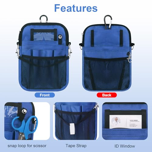 Bag Only! ( nurse supplies not included ) this work fanny pack is designed for busy medical professionals to nicely store the stethoscopes, scissors, pen lights and many other nurse accessories for work, this nurse belt pack keeps everything you need organized and easily located, help nurses and other healthcare professionals save time and improve work efficiency.This nurse organizer fanny pack is equipped with a large main compartment to keep the stethoscopes, bp cuffs and other important stuff, internal 1 zippered pouch help to secure your important belongings, 9 outer quick-access pockets to store syringes, pen lights, scissors, markers, thermometer and other medical supplies, keep all of your nursing accessories well-organized, help you to easily locate what you need.This nurse tool belt is designed with a detachable tape holder, you can keep the bandage tapes at your fingertips without having to dig through unorganized pockets, the nurse belt bag also comes with a metal snap loop to hold the medical scissors without falling while moving around. Front ID window with clear cover features visibility and protection, this nurse bags for work provides quick access and no need to take your ID card out.The medical organizer belt is made of tear resistant yet lightweight material for everyday use, This nurse fanny pack with stethoscope holder has high-quality oxford and nylon material, which is waterproof and durable, great for daily wear and tear, provides long-lasting performance. additional carabiner attached, this nurse waist organizer is convenient to clip on your waist belt and bags.This nurse pack hip medical accessories bag is featured with 1 adjustable and detachable waist strap ( Maximum length: 48 inches ) and 1 adjustable and removable shoulder strap ( Maximum length: 44 inches ) this nurse belt organizer pouch can be worn as a waist pack, crossbody bag, shoulder bag, or belt pouch according to your need, convenient for nurses and other healthcare professionals daily busy work.