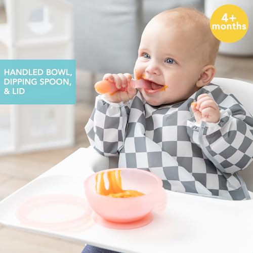 Bumkins Feeding Set with Suction, Includes Spoon and Lid, Training Essentials for Baby-Led Weaning, Toddler Self-Feeding, Babies Eating at 4 Mos Up, Pink Jelly