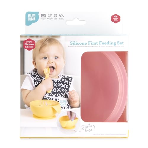 INCLUDES BOWL, SPOON AND LID – Bowl is designed with a curved handle that’s easily held by caregivers to help with feeding; easy-to-grip double-ended silicone spoon grows with baby – one end for dipping into purees, the other for scooping solid foodCONVENIENT FOR MEALTIME – Silicone can withstand low and high temperatures, easily transitioning from the refrigerator or freezer to the oven or microwave; oven-safe up to 400F/204C; top-rack dishwasher-safe; making feeding and cleanup easyPLATINUM CURED LFGB SILICONE – Bumkins uses the highest quality curing process; it does not result in the creation of any by-products, ensuring you get the purest silicone; made from 100-percent food-safe siliconeABOUT PINCH TESTS – There is a lot of information out there about pinch tests as a way to tell if silicone has fillers; however, the pinch test is not a real scientific test and, therefore unreliableEASY TO CLEAN – Hand wash and top-rack dishwasher safe; may be boiled for deep cleaning; silicone can absorb scents, we recommend cleaning with unscented, natural detergent