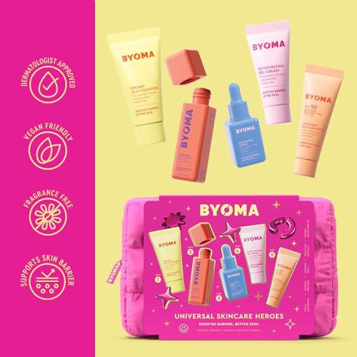 BACK TO THE BASICS: Meet our Universal Starter Kit for hydrated, glowing skin. This 5-step routine boosts, build + protects skin, serving as the building blocks to your best skin. Clincally proven to maintain + protect the skin barrier.HYDRATE + REBUILD: Skin-loving ingredients work to rebuild + protect the skin barrier. Powerful humectants lock in moisture to minimize trans-epidermal water loss (TEWL).BARRIER-BOOSTING: BYOMA’s carefully researched Tri-Ceramide Complex is designed to mimic and replenish the essential lipids found in skin. Formulated to rebuild the skin barrier + restore moisture levels, ensuring skin functions at its best every day.THE ULTIMATE SKIN-COMPATIBLE SOLUTION: Dermatologist tested + approved skin care, soap-free, non-comedogenic, alcohol + fragrance-free, vegan + cruelty free. Suitable for all skin types.BACKED BY SCIENCE: Efficacy is the new luxury. That's why BYOMA delivers clinically-proven formulas backed by science + powered by actives. When we stop stripping our skin + start boosting our barrier, we find the key to balanced, brighter skin.