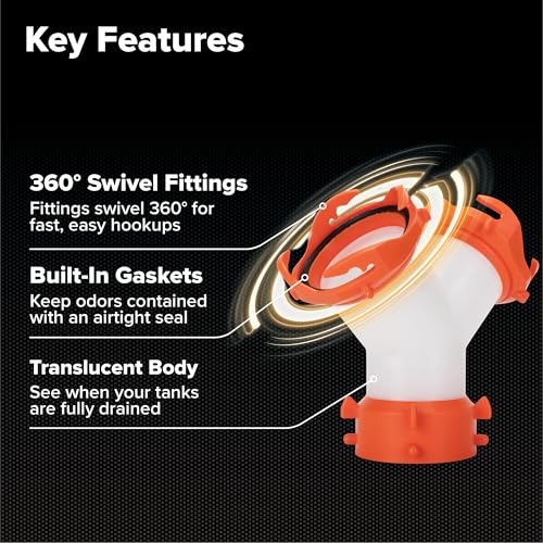 Easily Connects Two Sewer Hoses: This Camco RV sewer fitting Effortlessly connects two camper sewer hose assemblies to one dump station for seamless waste disposal.Swivel Fittings for Ease of Use: Each RV sewer hose fitting swivels 360° for quick & efficient connections. Featuring two bayonet fittings & one lug fitting, it ensures a Secure attachment to two tank outlets.Secure & Odor-Tight Connection: Built-in gaskets ensure an odor-tight connection, keeping in unwanted smells.Translucent Body: Easily monitor RV tank levels with the translucent body. Now you can see when your RV hose has finished draining with this camper must-have.Durable Construction: Crafted from UV-resistant materials, this RV essential provides durability and long-lasting use, even under harsh outdoor conditions.