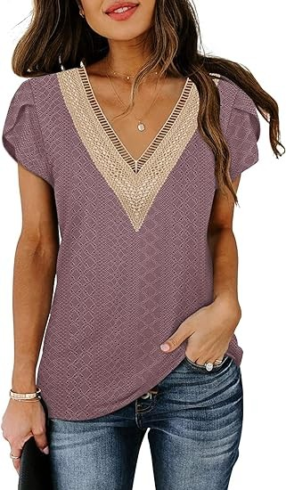 Features: Cap sleeve tops,Short sleeve shirts balck, Lace petal sleeve,V Neck,Solid Color, Cute printed,Striped, Tie dye,Boho Floral Print
