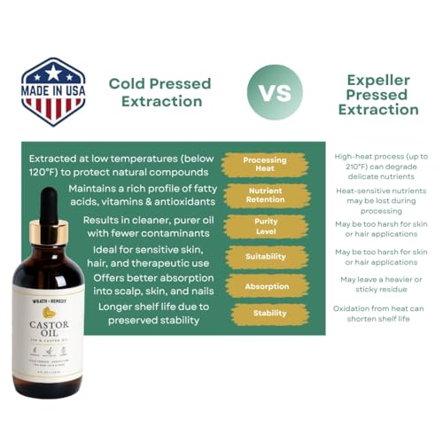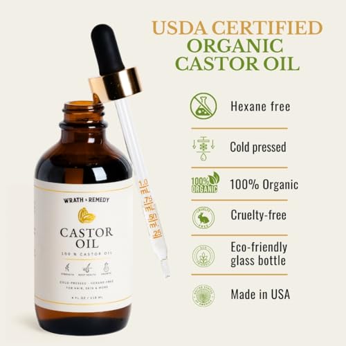 ?️ VISIBLY FULLER LASHES & BROWS — Unlock naturally thicker, longer-looking lashes and brows with organic hexane free castor oil for eyelashes. Our precision glass dropper ensures clean, targeted application to delicate areas, while nutrient-rich fatty acids nourish hair follicles from the root. With consistent use, your lashes and brows look stronger, fuller, and healthier without false lashes or synthetic serums? RADIANT, HYDRATED, & YOUTHFUL SKIN — Our castor oil for skin deeply replenishes the moisture barrier, softens rough patches, and reduces the appearance of fine lines and age spots. Enriched with ricinoleic acid and antioxidants, it calms dryness and irritation while restoring elasticity and a healthy glow. Gentle enough for sensitive skin, it can be used as a night oil, daily moisturizer, or DIY mask booster for spa-quality results at home? A MULTI-USE BEAUTY & WELLNESS ESSENTIAL — From lashes to scalp to skin, Wrath & Remedy Castor Oil is a true all-in-one solution. Use it as a lash and brow serum, hydrating facial oil, natural makeup remover, cuticle and nail strengthener, or soothing massage oil. It also pairs perfectly with castor oil packs for relaxation, improved circulation, and natural detox support, making it a holistic self-care staple? PREMIUM AMBER GLASS & DROPPER DESIGN — Purity deserves protection. Bottled in amber glass with a gold-accented precision dropper, it shields potency while preventing waste. Unlike bulky plastic or messy pumps, our elegant 4oz bottle offers controlled, mess-free application and travels easily; designed to look as refined on your vanity as it feels in your self-care ritual? CERTIFIED ORGANIC PURITY & FRESHNESS — USDA Certified Organic, non-GMO, cold-pressed, and hexane-free, responsibly sourced from premium organic castor beans. Every batch is small-batch bottled in the USA under GMP-certified standards and third-party tested for quality and consistency. You receive only the freshest, most potent oil, never diluted or mass-produced