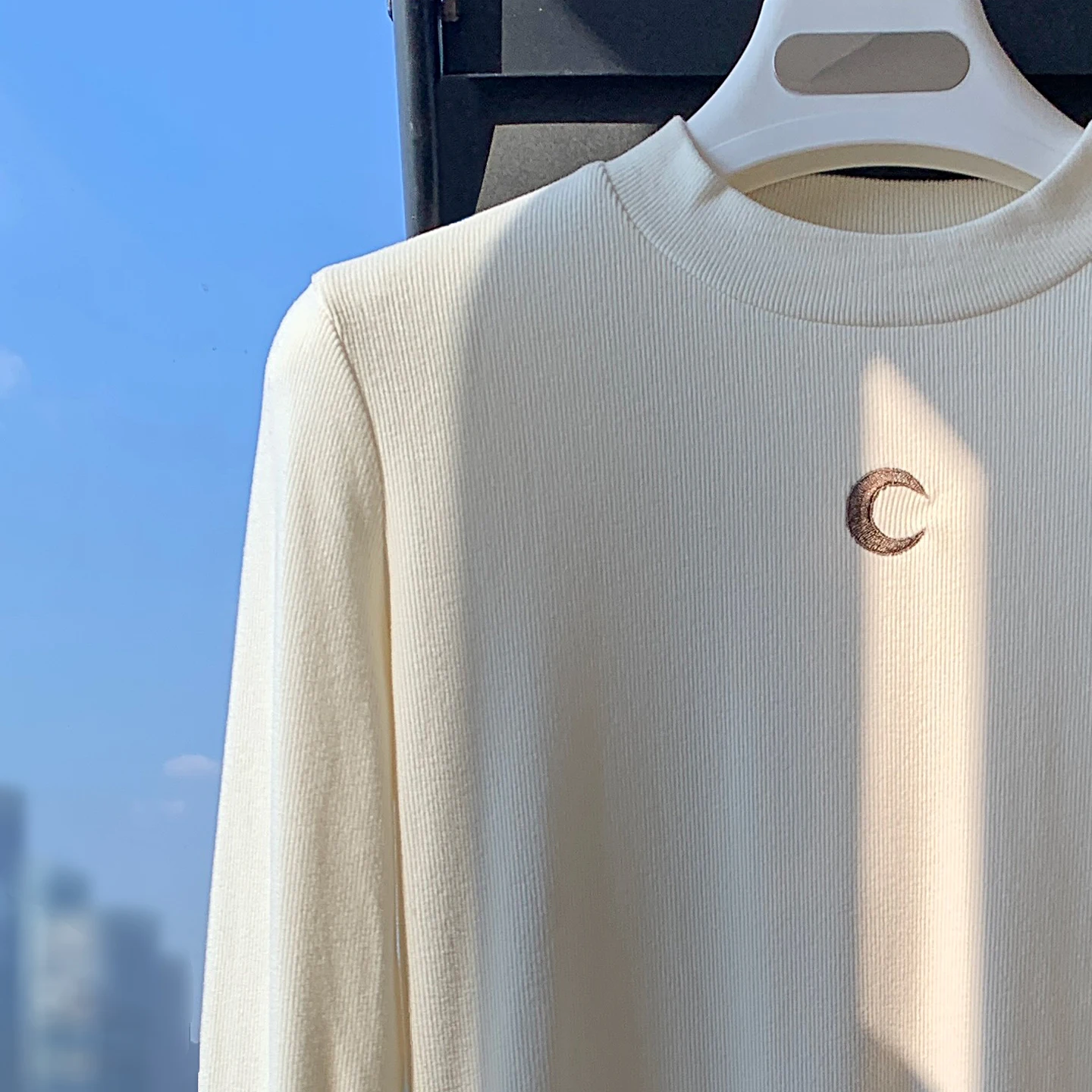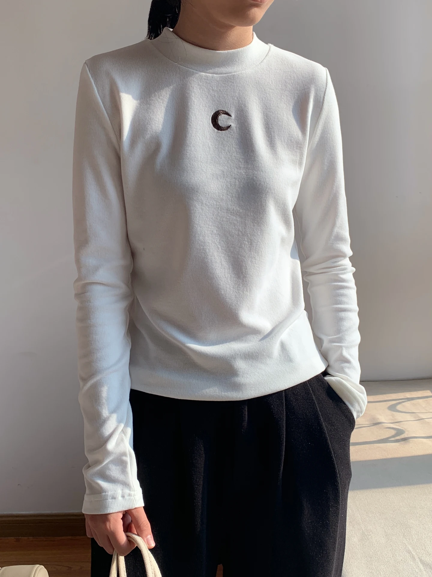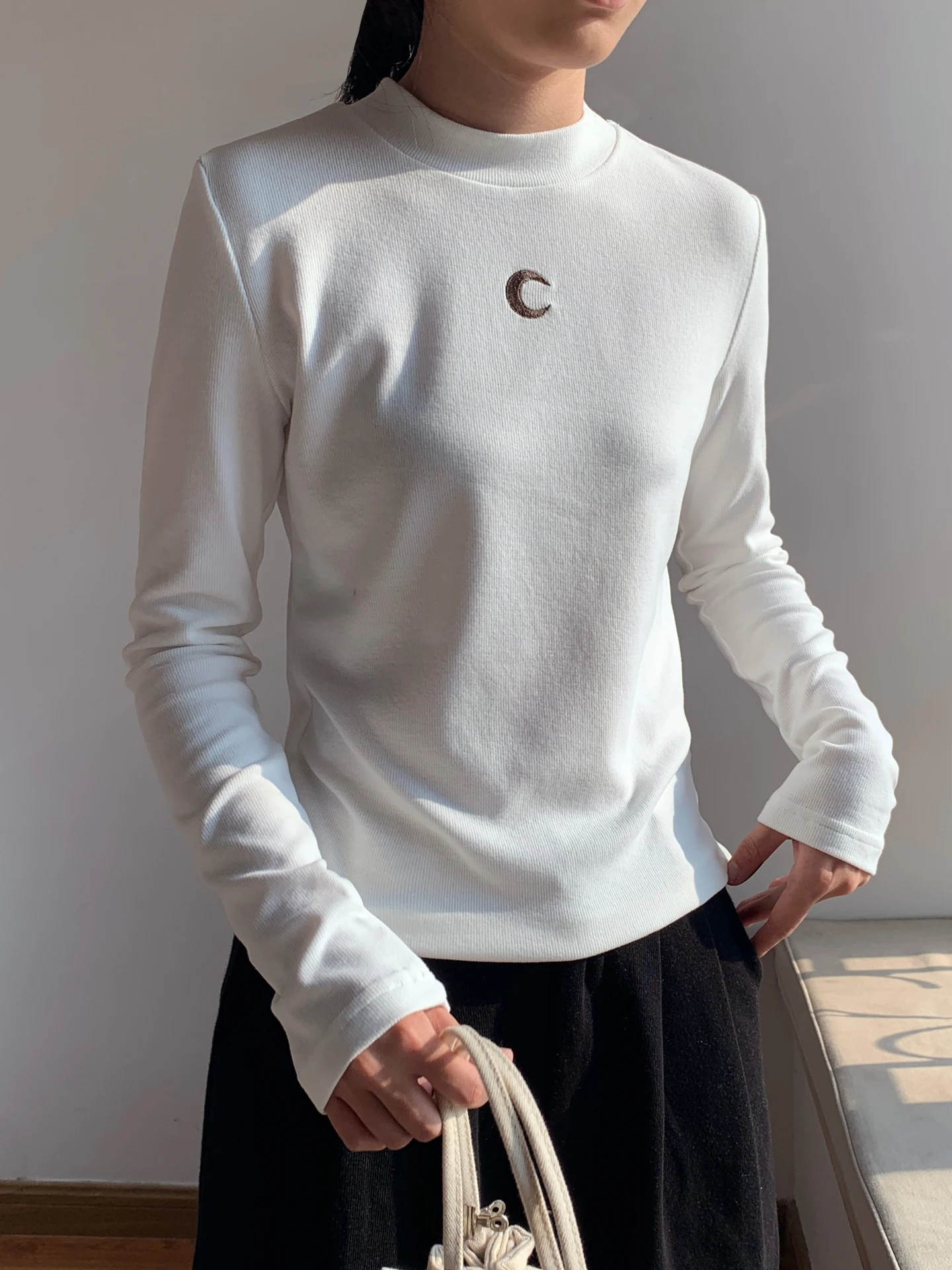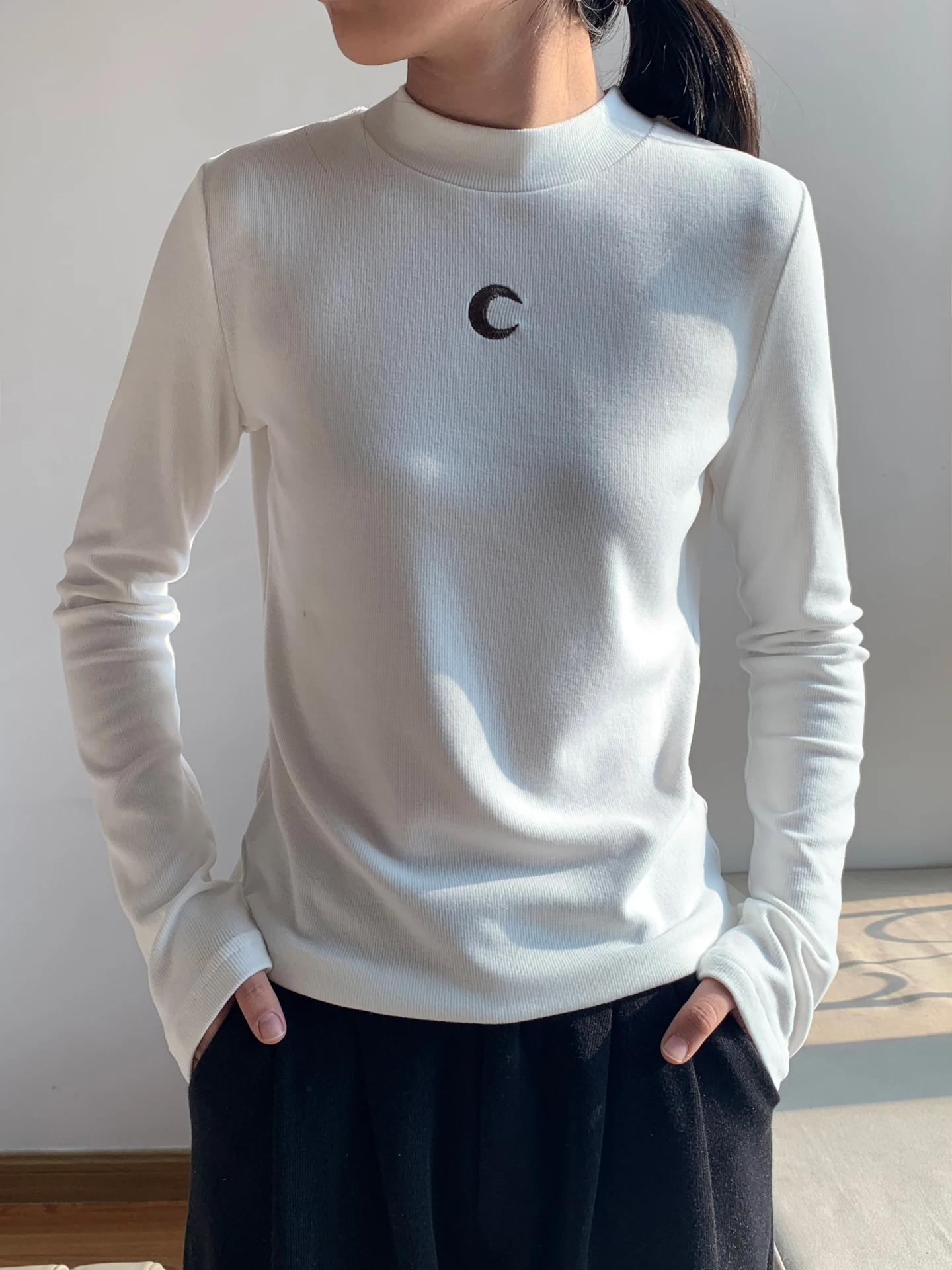 Casual Base Top Women Long Sleeve Tshirt Semi High Neck Moon Embroidery Korean Fashion Solid Color Versatile Spring New