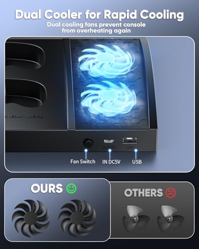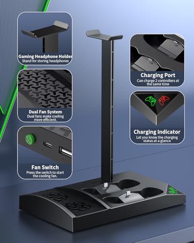 Charger Stand with Cooling Fan for Xbox Series S Console and Controller,Vertical Dual Charging Dock Accessories with 2 x 1400mAh Rechargeable Battery and Cover, Earphone Bracket for XSS(Black)