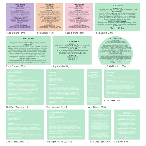 33 Pcs Advanced Skin Care & Spa Set: This gift set contains premium tea tree essential oil products with 100ml face gel cleanser, 30ml hand cream, 120ml face cream, 2 pcs sheet face mask, 2 pcs hydrolyzed real collagen mask, 3 pcs gel under patches, 3 pcs gel lip mask, 30ml clay mask, 30ml lavender face serum, 15ml orange face serum, 15ml yalng ylang face serum, 15ml rose hyaluronic acid face serum, gua sha, face clean sponge, 150g bath bombs, lip gloss, silk sleep mask, spa headband, bath puff, fuzzy sock, silk hair tie, earlugs, eyebrow razor, necklace, perfume, leather cosmetic bagSkin-Loving Ingredients: All Rosa Acca products are made from skin-loving ingredients you want. Rich in tea tree essential oils, ceramide, shea butter, argan oil, coconut oil and hyaluronic acid, it can effectively cleanse and moisturize your skin, Whether you have dry, oily or normal skin, our skincare & spa set is suitable for all skin typesSpa Gift Baskets for Women: Our spa baskets for women gift set is a good present to pamper that special someone. This exquisite collection of skin care gifts for women will make her feel truly indulged and cherished. Treat yourself or a loved one to a luxurious self care experience with our beauty kits for women spa gift basketsHead To Toe Skin Care: Let this skin care kit pamper your skin! Clay mask and gel cleanser to cleanse your skin. Under Eye patches for reduce dark circles, eye bags. Gel lip mask and lip gloss for plump lips. Sheet masks, face cream, face serum and hand cream for nourished, hydrated skin. Bath bombs to pleasure the body and mind. Perfume ensures that the delightful fragrance lasts all day, keeping you fresh and confidentAll Gift Occasions: This gift set is ideal for Mother's Day, Birthday, Christmas, Valentines's day, New Job, New Baby, Anniversary, Bridesmaid, Bridal Shower, Housewarming, Wife, Mom, Grandmother, Sister, Daughter in law, Best Friend, Coworker, Cousin, Aunt, Niece, Teacher, Sister in law, Employee or Girlfriend. Our gift boxes are the perfect choice for putting a smile on their faces. So, what are you waiting for? Just get this luxury gift