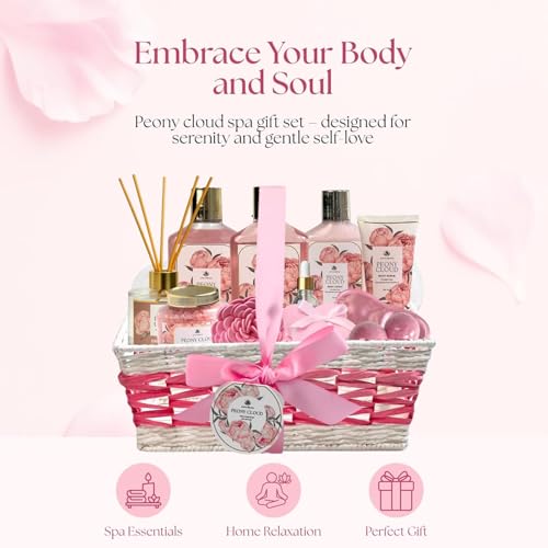 Christmas Spa Gifts for Women – Peony Cloud | 13-Piece Self Care Gift Set with Bubble Bath, Bath Bombs, Peony Diffuser, Lotion, Shower Gel, Bath Salt & More | Bath and Body Gift for Her Birthday