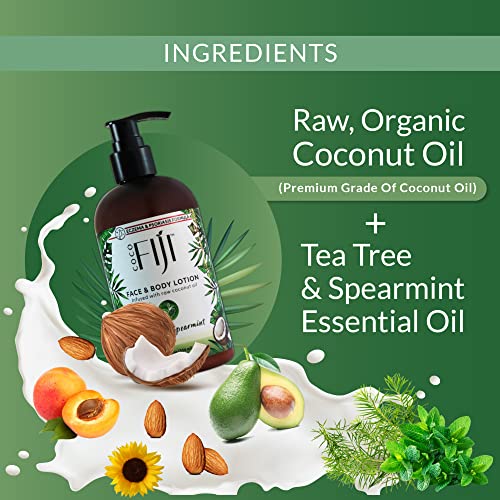 Coco Fiji Face & Body Lotion Infused With Coconut Oil , Lotion for Dry Skin , Moisturizer Face Cream & Massage Lotion for Women & Men , Tea Tree Spearmint 12 oz, Pack of 1