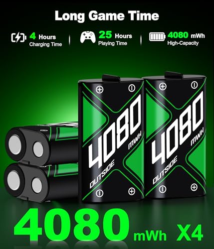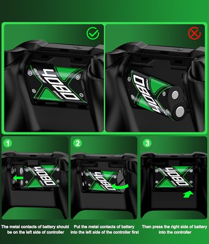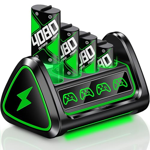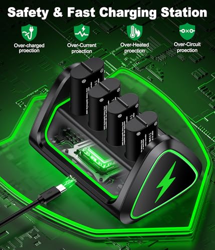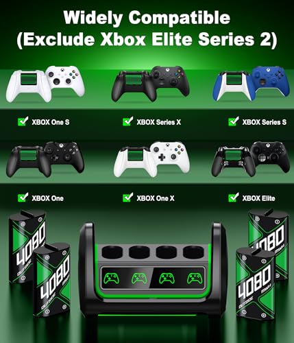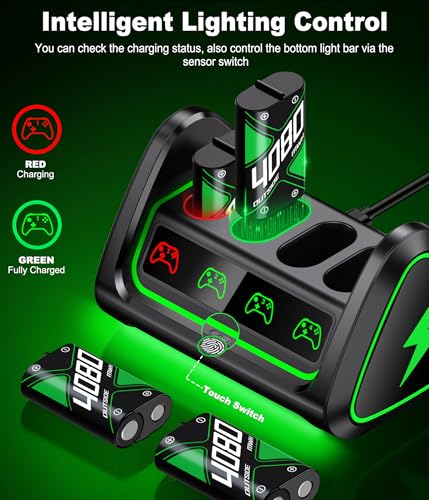 COOL LIGHT BAR ENHANCES GAMING AMBIENCE: The charger station for Xbox Series X not only comes with a light bar on the bottom, which can be controlled by a smart fingerprint touch-sensitive switch. With 4 charging indicators on the front make you to check the charging state of Xbox rechargeable battery packCHARGER BATTERY PACK FOR XBOX CONTROLLERS: DXKK Xbox controller battery pack is long-lasting. Compared with aa batteries, these battery packs for official Xbox controller have a longevity and more durable, which makes you save the cost of aa batteries and protect the environmentSAFETY PROTECTION WITH XBOX CONTROLLER CHARGER: The Xbox Series X controller battery pack has a built-in smart chip with overheat ,overcharge, overcurrent, and short circuit protection during charging. You can storage and charge the battery pack safely and ensure uninterrupted gaming on Xbox One and Xbox Series X,S controllersFAST CHARGING SPEED & LONG GAME TIME: 4x4080mWh rechargeable Xbox battery pack has a long battery life which means it can be recharged more than 3,000 times. And a single last 25 hours of playing time and just need 4H to be fully charged in the charging case for Xbox one controller battery packFIT OFFICIAL XBOX CONTROLLERS: The rechargeable battery pack is compatible with older Xbox Series X/S, Xbox One/One X/One S/One Elite controllers(exclude Xbox Elite wireless controller Series 2). These batteries fit perfectly without any gap or loosening. We provide 12 months battery replacement service if the battery pack have the problems