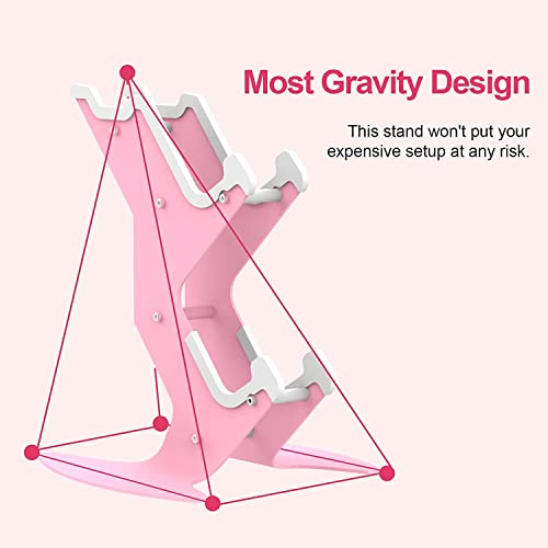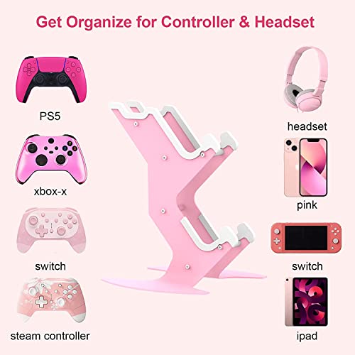 Universal Pink Controller Stand - Works with Xbox sereis X ,Xbox One, 360, PS5,PS4 ,Nintendo Switch, Steam Controller,gaming headset , Desktop PC Gamepads and most other third party made game controllers,mobile phones.Unique Artistic and Stability Design - The stand was made of high quality thickened aluminum alloy, Constructed with advanced Multi-layer Forging technology, strong, durable, and only 0.078 inches thick. It was designed with a gravity base that can be place on your desks, shelves, cabinets, glass surfaces. It also a piece of art in your home.Get Organize for Controller & Headset - The stand was specially designed to store 2 game controllers and one gaming headset, so you can place your controllers and gaming headset neatly in your conveniently way, and with the soft silicone coating edge, better to preventing damage and keeping your game-space clutter-free and organized.Easy Installation - Easy to build this stand and you will be surprised to see that the finished product is artistic. Gap design in the middle for easy charging and wired cord storage.Easy to use and the surface is easy to clean and wipe clean.After Sales Service - If you have any questions, please feel free to contact us. If there is a problem with our product, you can request a refund and we will process it within 24 hours.