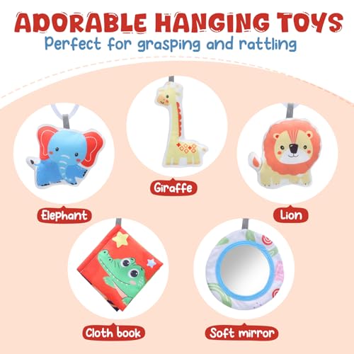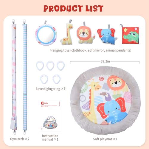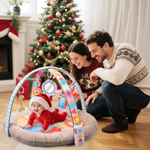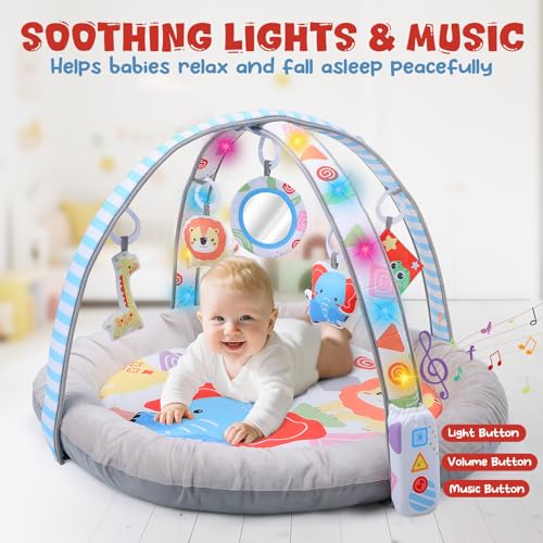 Enchanting Lights & Soothing Music: Engage your baby's senses and encourage tummy time with our delightful light-up baby play mat! It features music and gentle lights with an adjustable volume control (including a quiet mode for peaceful play). This sensory stimulation is key for auditory and visual development, keeping your little onePremium Comfort & Safety: Our ultra-soft, extra-thick play mat provides a comfortable and secure space for your baby to explore. The lush padding offers optimal support for lying, kicking, tummy time, sitting, and crawling, ensuring comfort and safety during every developmental milestone. It's the perfect padded surface for your baby's adventuresDetachable Hanging Toys: Includes 5 removable sensory toys (lion, elephant, rattle, soft mirror, and cloth book). Each toy (except the soft mirror) makes fun sounds when shaken, helping develop hand-eye coordination, grasping skills, and early auditory awarenessRemovable & Machine Washable Design: The baby activity mat is easy to detach, the mat can be removed for standalone use or taken out for easy machine washing, keeping your baby’s play space always fresh and cleanGrows with Your Baby: Suitable for newborns and toddlers. Use as a tummy time mat for 3–6 months, a baby play gym with toys for sensory exploration, or remove the arches for a soft activity mat as your little one grows. Perfect gift for baby boys and girls