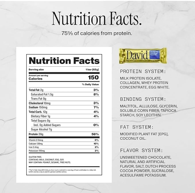 VARIETY PACK: Contains 6 delicious flavors including 2-Chocolate Chip Cookie Dough, 2-Peanut Butter Chocolate Chunk , 2-Blueberry Pie , 2-Cake Batter, 2-Salted Peanut Butter, 2-Fudge BrownieHIGH PROTEIN: Each bar delivers 28g of premium protein from milk protein isolate, collagen, whey protein concentrate, and egg whiteNUTRITION FACTS: Only 150 calories per bar with 0g sugar, making it perfect for health-conscious snackers and fitness enthusiastsCONVENIENT PACKAGING: Pack of 8 individually wrapped bars, ideal for on-the-go snacking, post-workout recovery, or meal replacementINGREDIENTS: Made with quality proteins, natural and artificial flavors, modified plant fats, and sweetened with maltitol and allulose